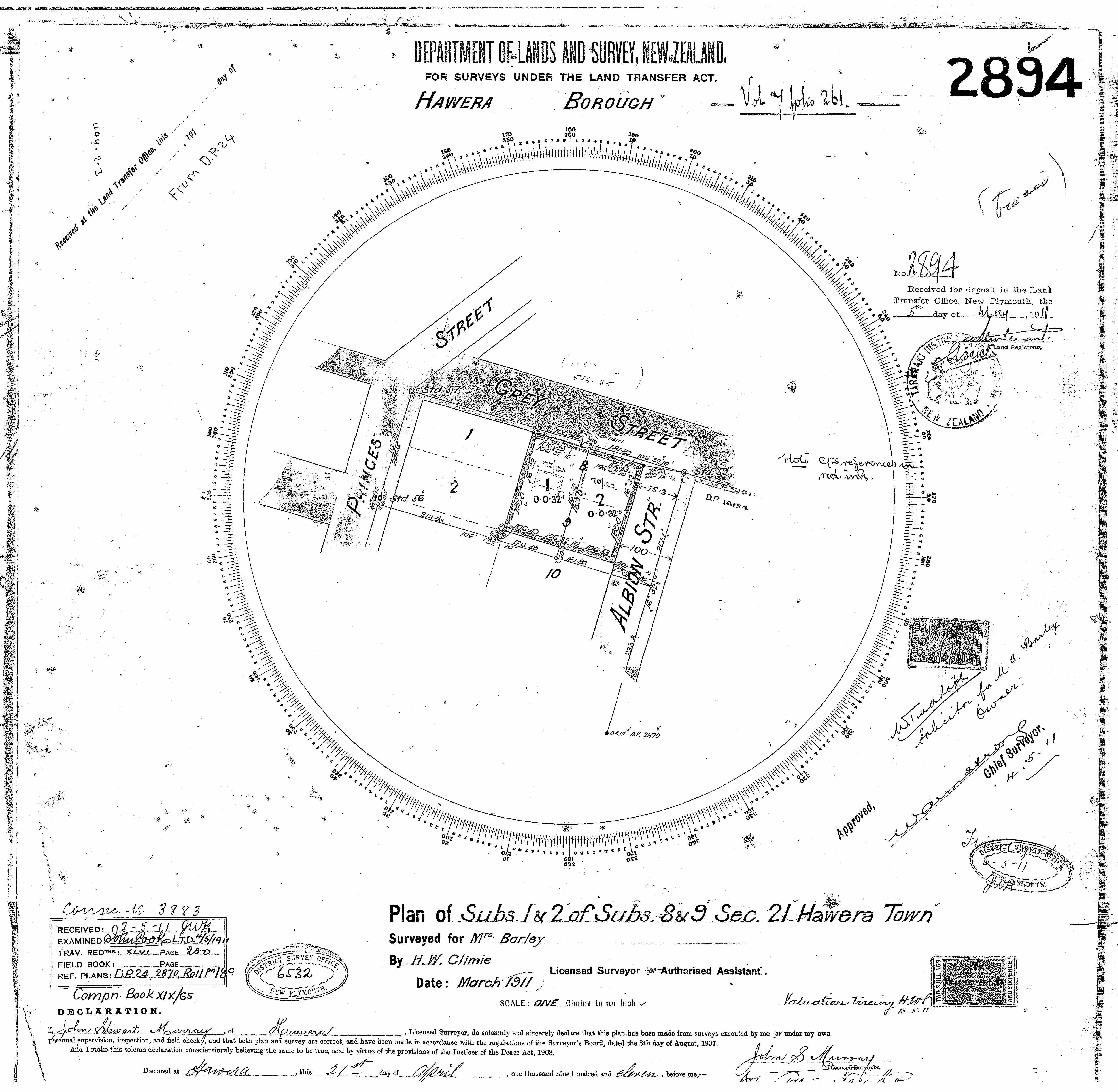 Taranaki DP2894 Sheet 1 (1911), ICS Pre 300,000 Cadastral Plan Index (Imaged by LINZ)