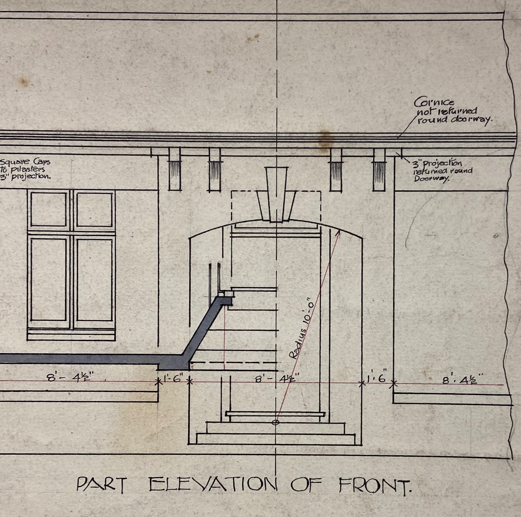 It's possible that the exterior is quite different today than when first built, however, some detailing on the front Princes Street entrance can be seen on the original plans (ARC2004-1102 - detail) held by Puke Ariki.