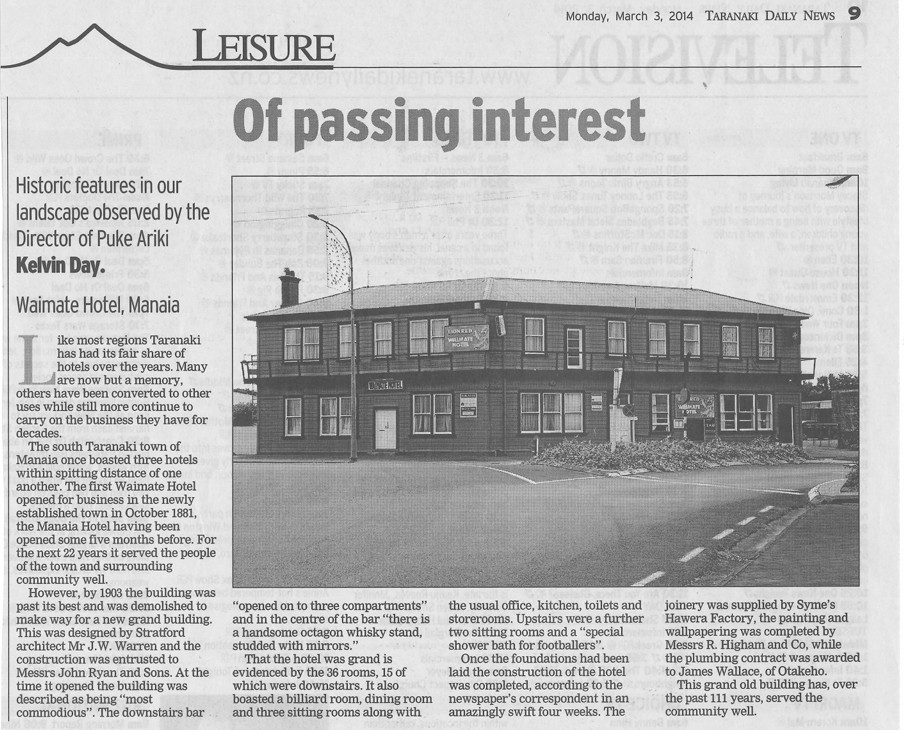 The hotel featured in Kelvin Day's "Of passing interest" series in 2014 and is listed in the Manaia Heritage Inventory (2003).