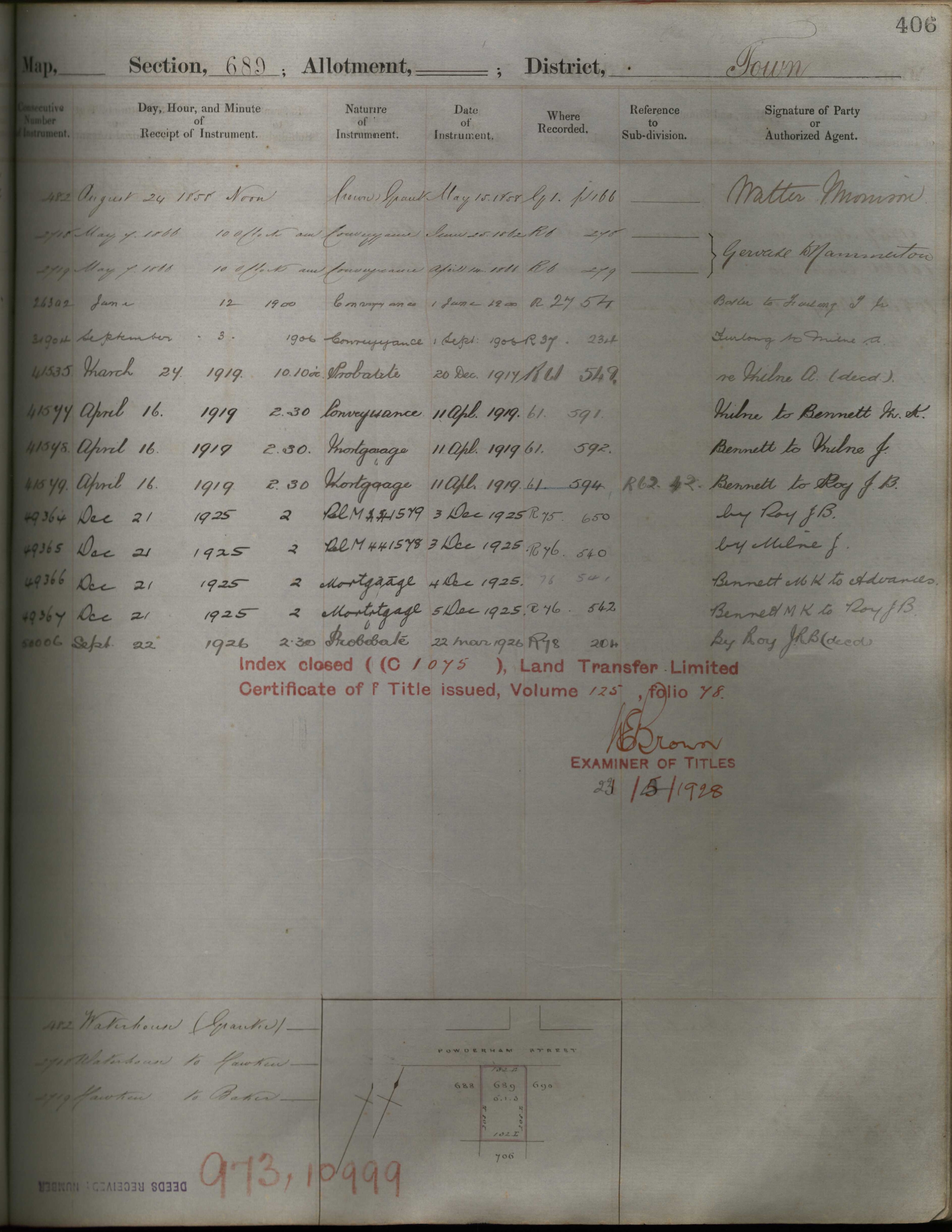 Town Section 689, Taranaki Land Deed Index I1 page 406. (Archives New Zealand)