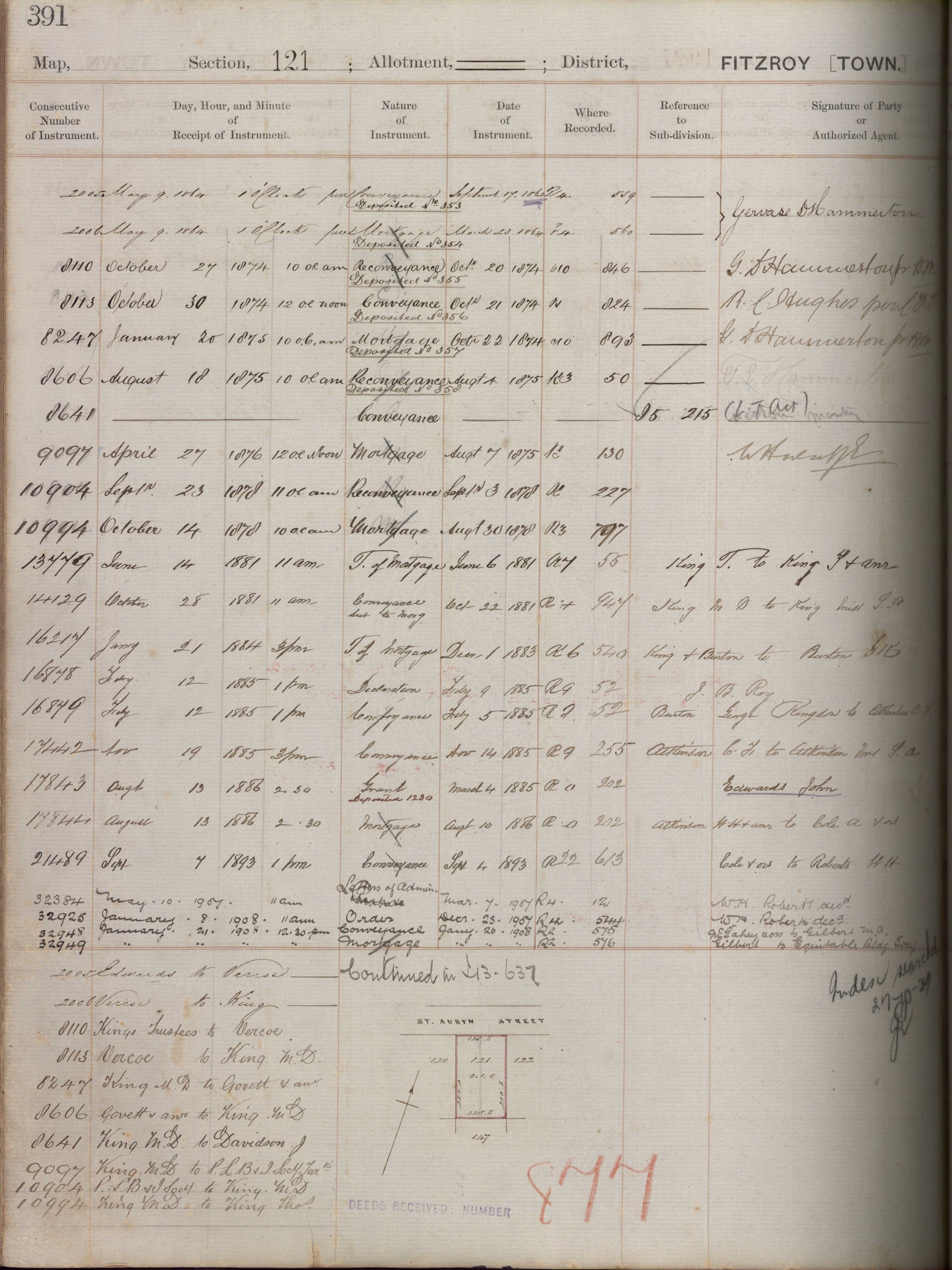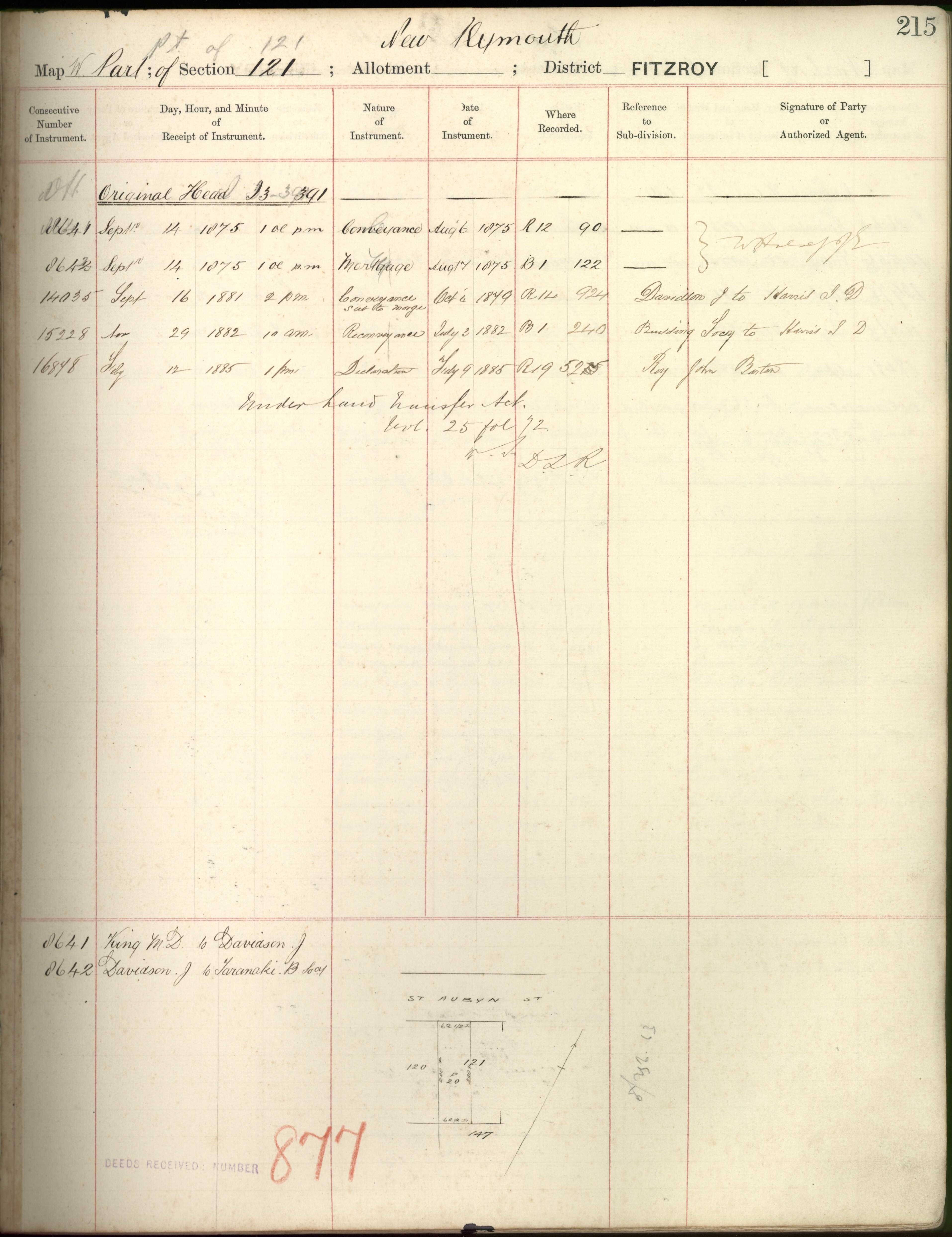 Town Section 121, Taranaki Land Deed Index I3 Page 391 and I5 Page 215. (Archives New Zealand)