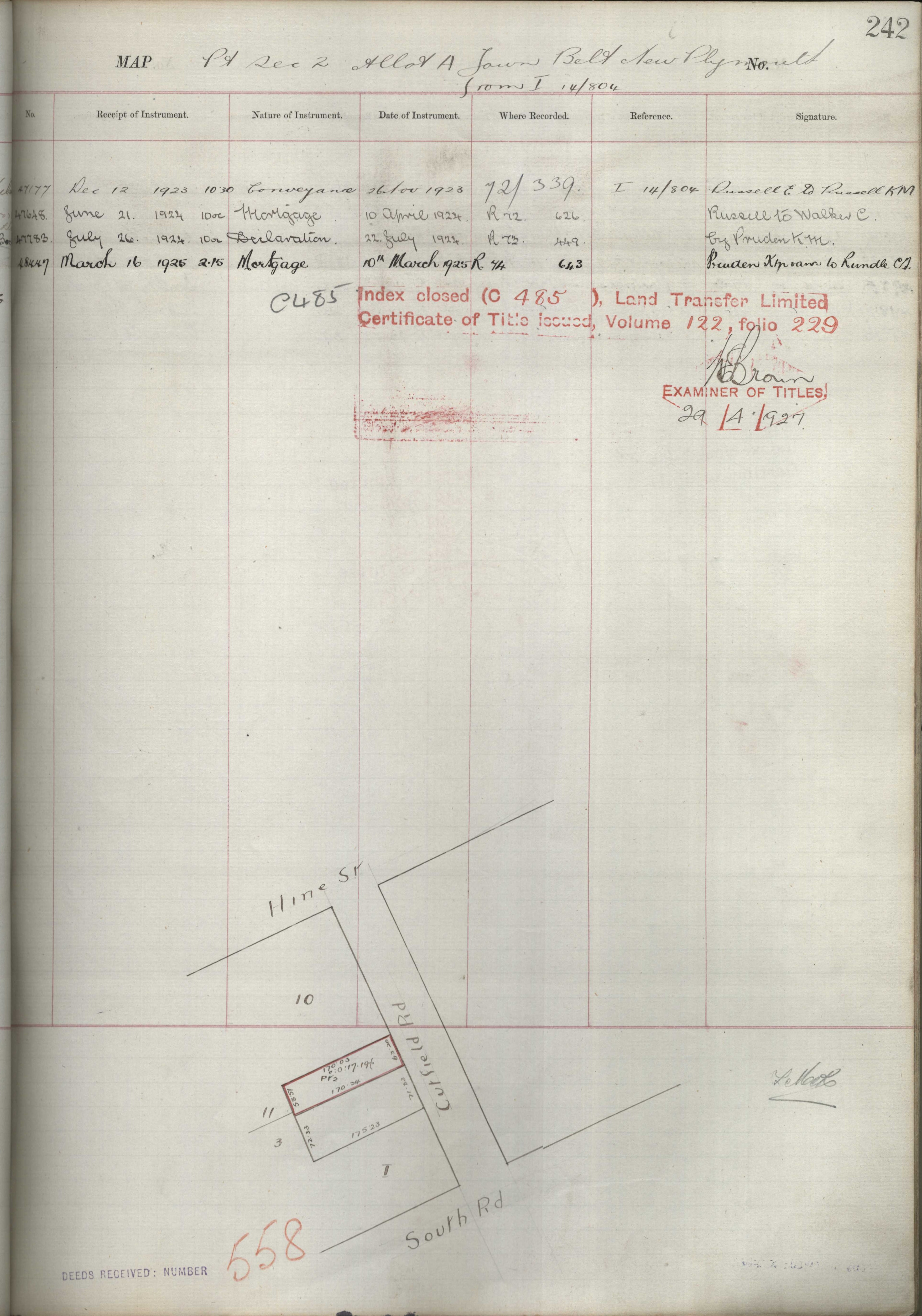 Town Belt (Part A), Taranaki Land Deed Index I12 Page 242. (Archives New Zealand)