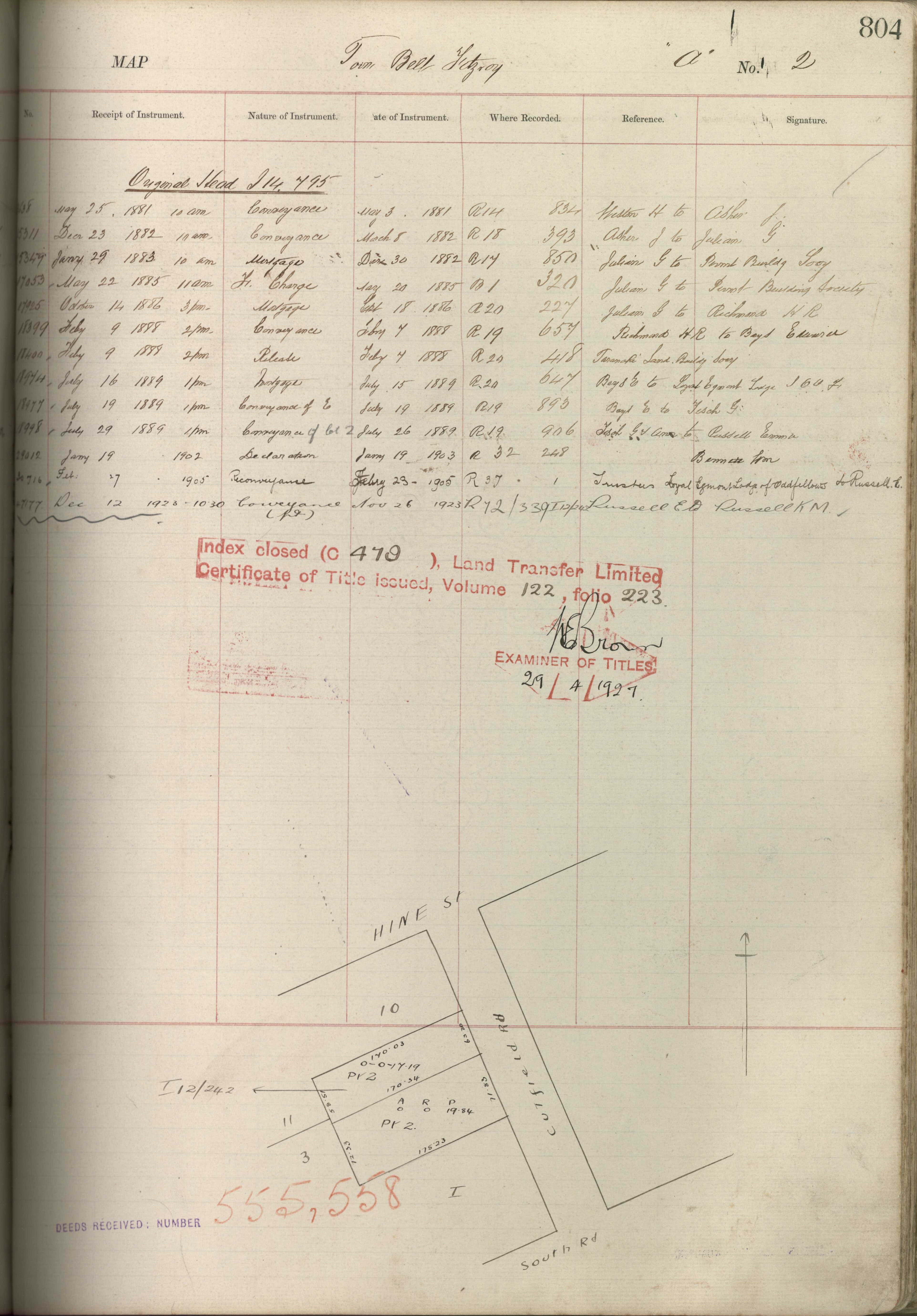 Town Belt A, Taranaki Land Deed Index I1 page 556. (Archives New Zealand)