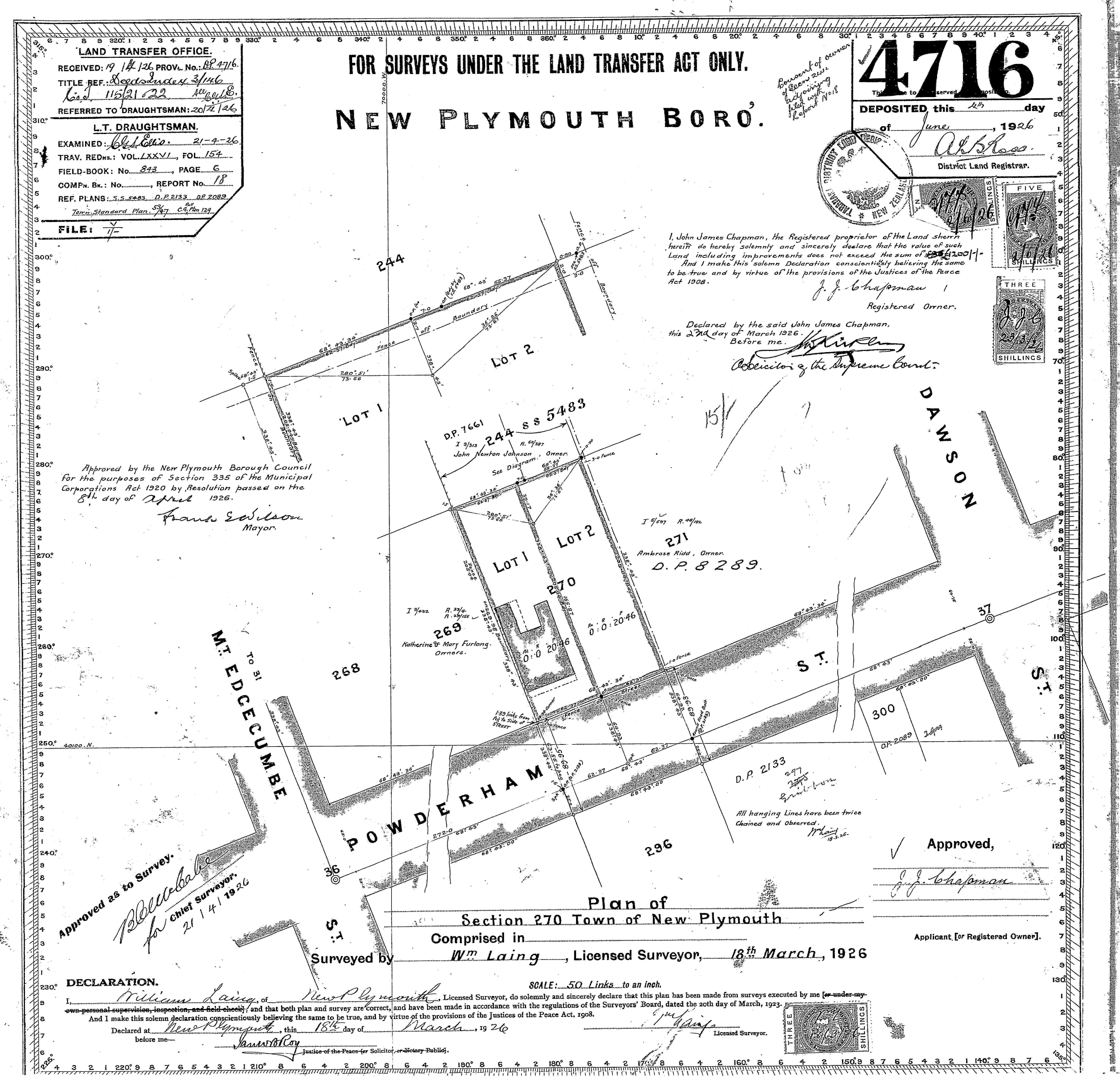 Taranaki DP4716 Sheet 1 (1926), ICS Pre 300,000 Cadastral Plan Index (Imaged by LINZ)