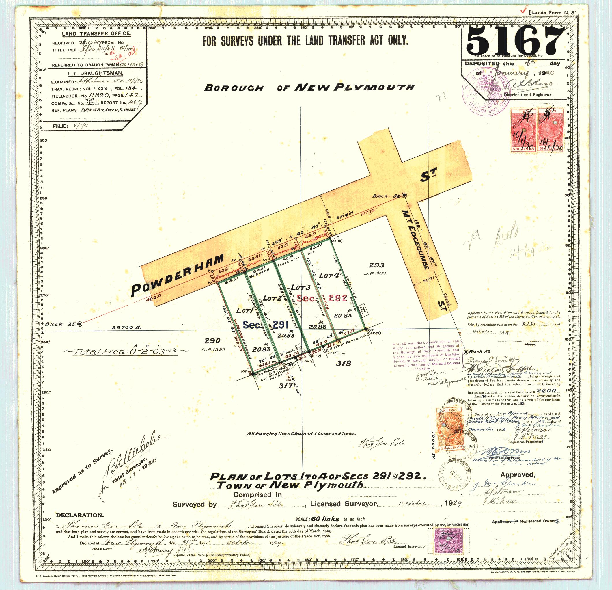 Taranaki (Lot 3) DP5167 Sheet 1 (1929), ICS Pre 300,000 Cadastral Plan Index (Imaged by LINZ).