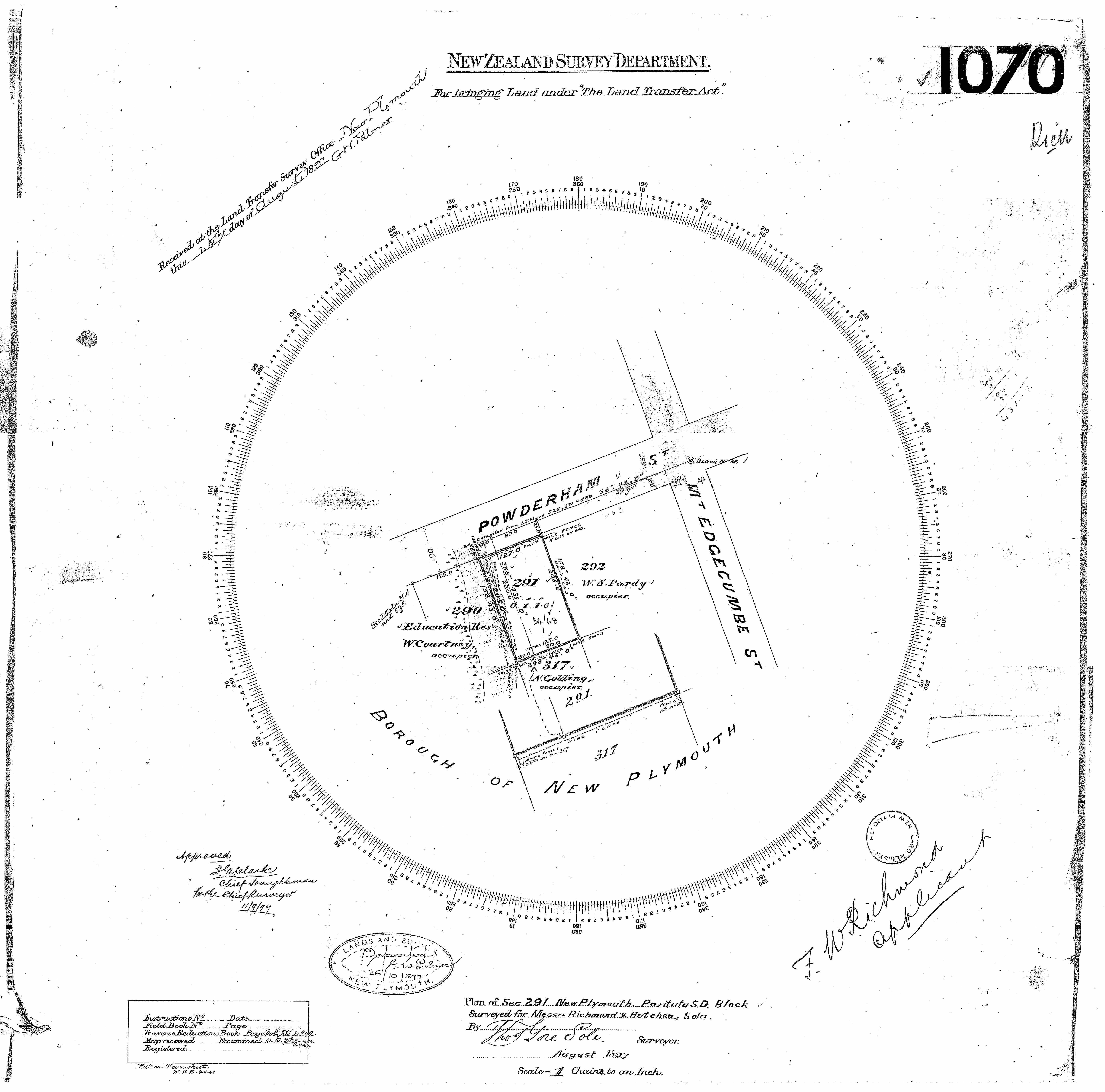 Taranaki DP1070 Sheet 1 (1897), ICS Pre 300,000 Cadastral Plan Index (Imaged by LINZ).