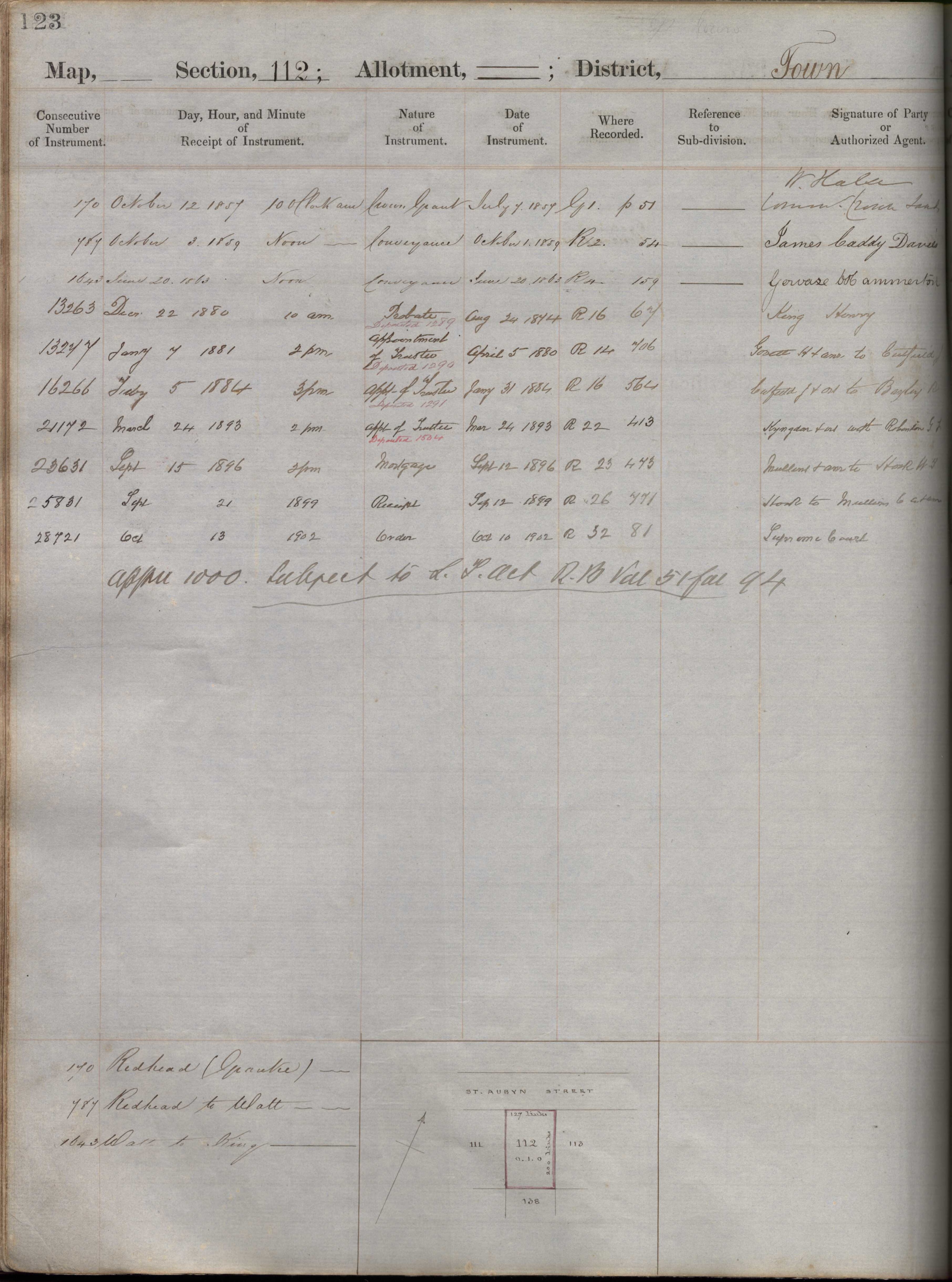 Town Section 112, Taranaki Land Deed Index I1 page 123. (Archives New Zealand)