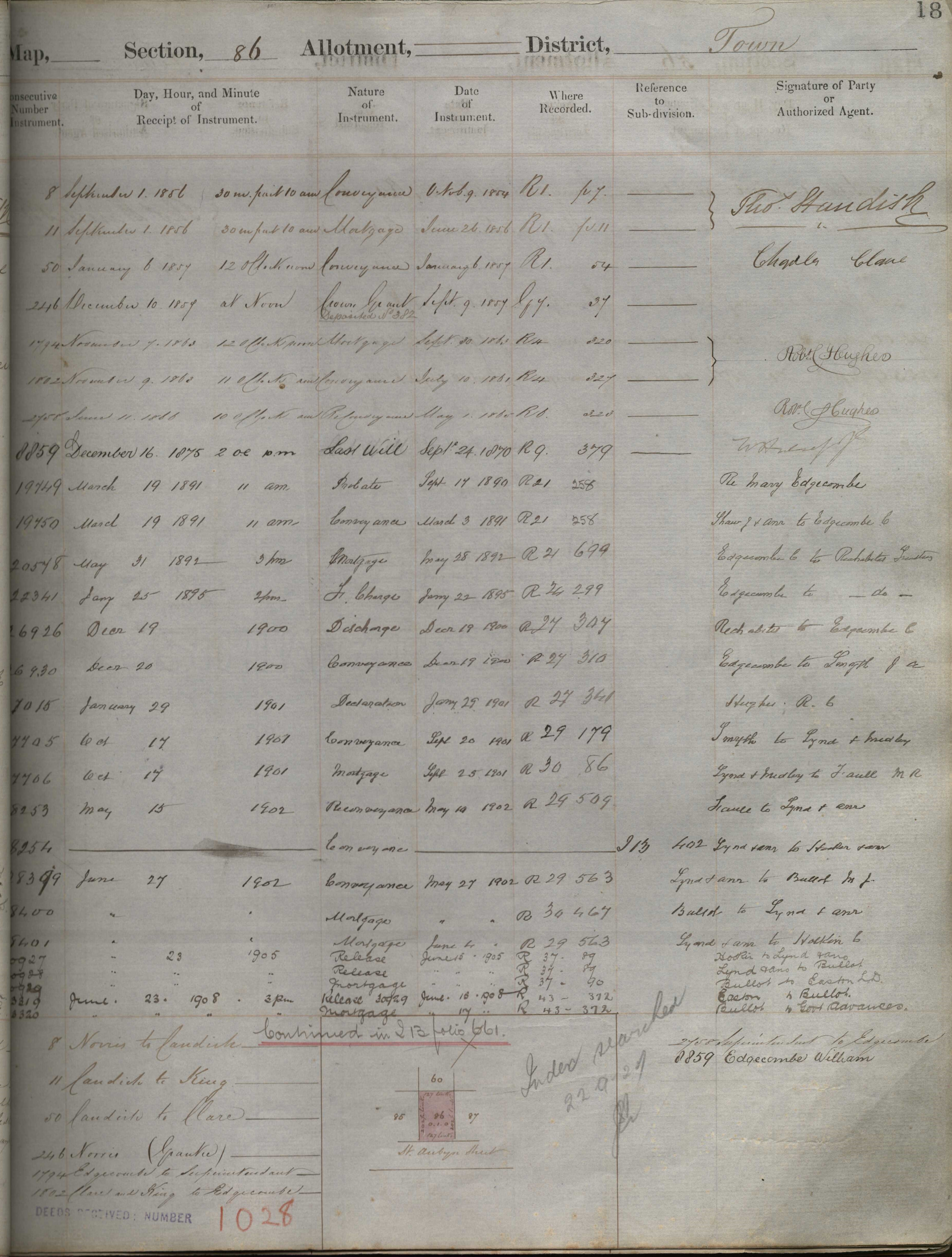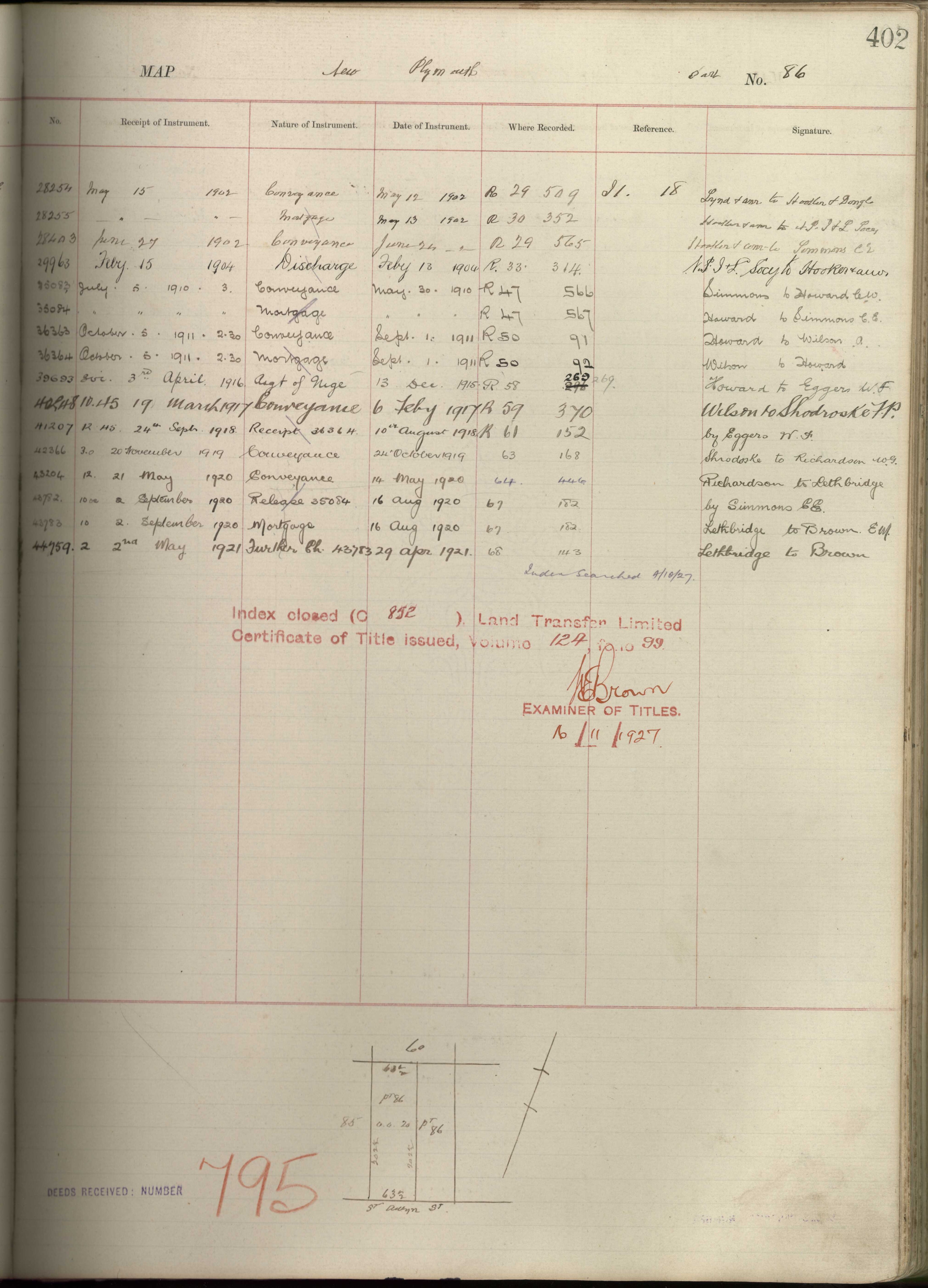Town Section 86, Taranaki Land Deed Index I1 page 18 and I13 page 402. (Archives New Zealand)