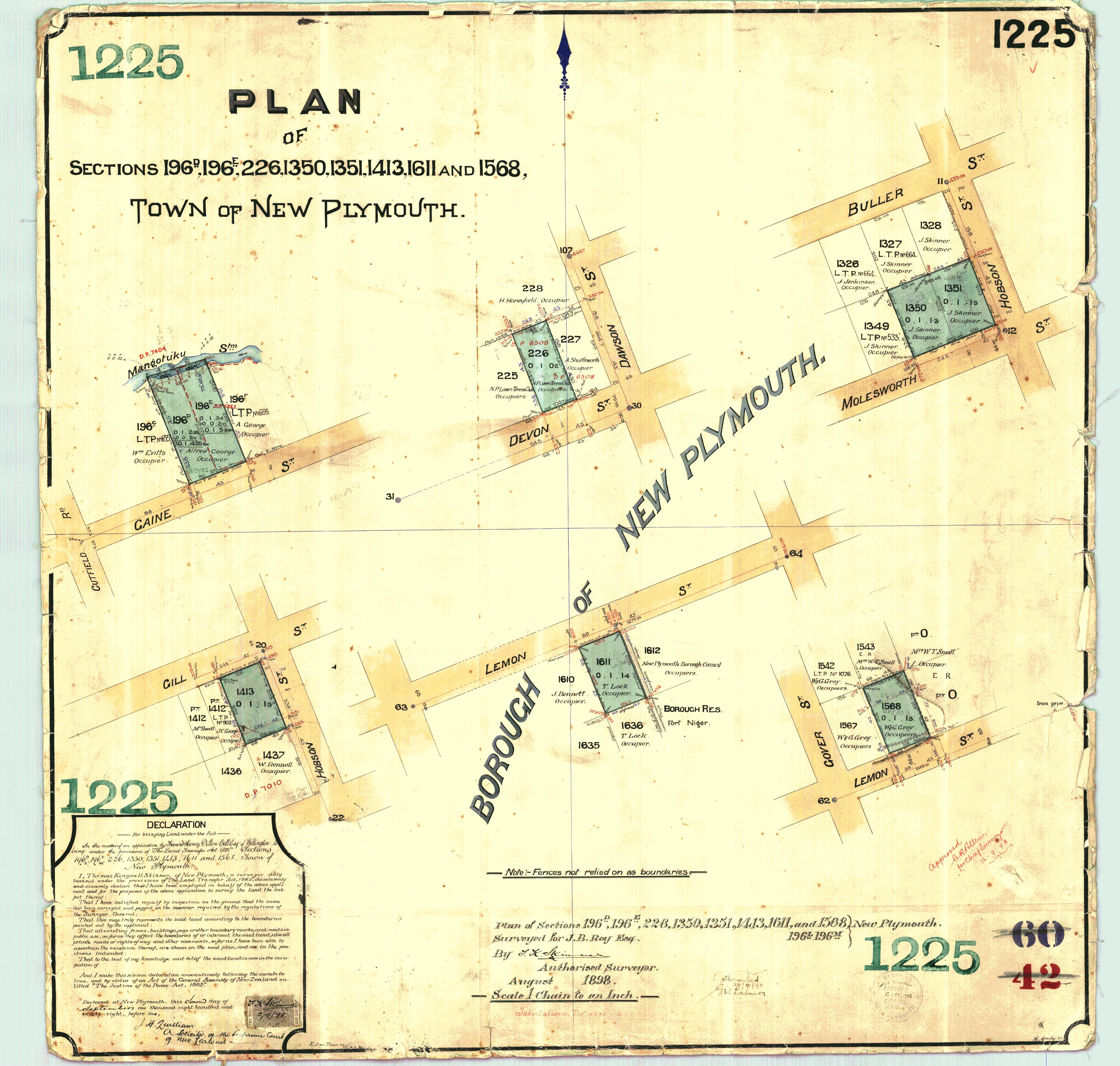 Taranaki DP1225 Sheet 1 (1898), ICS Pre 300,000 Cadastral Plan Index (Imaged by LINZ)