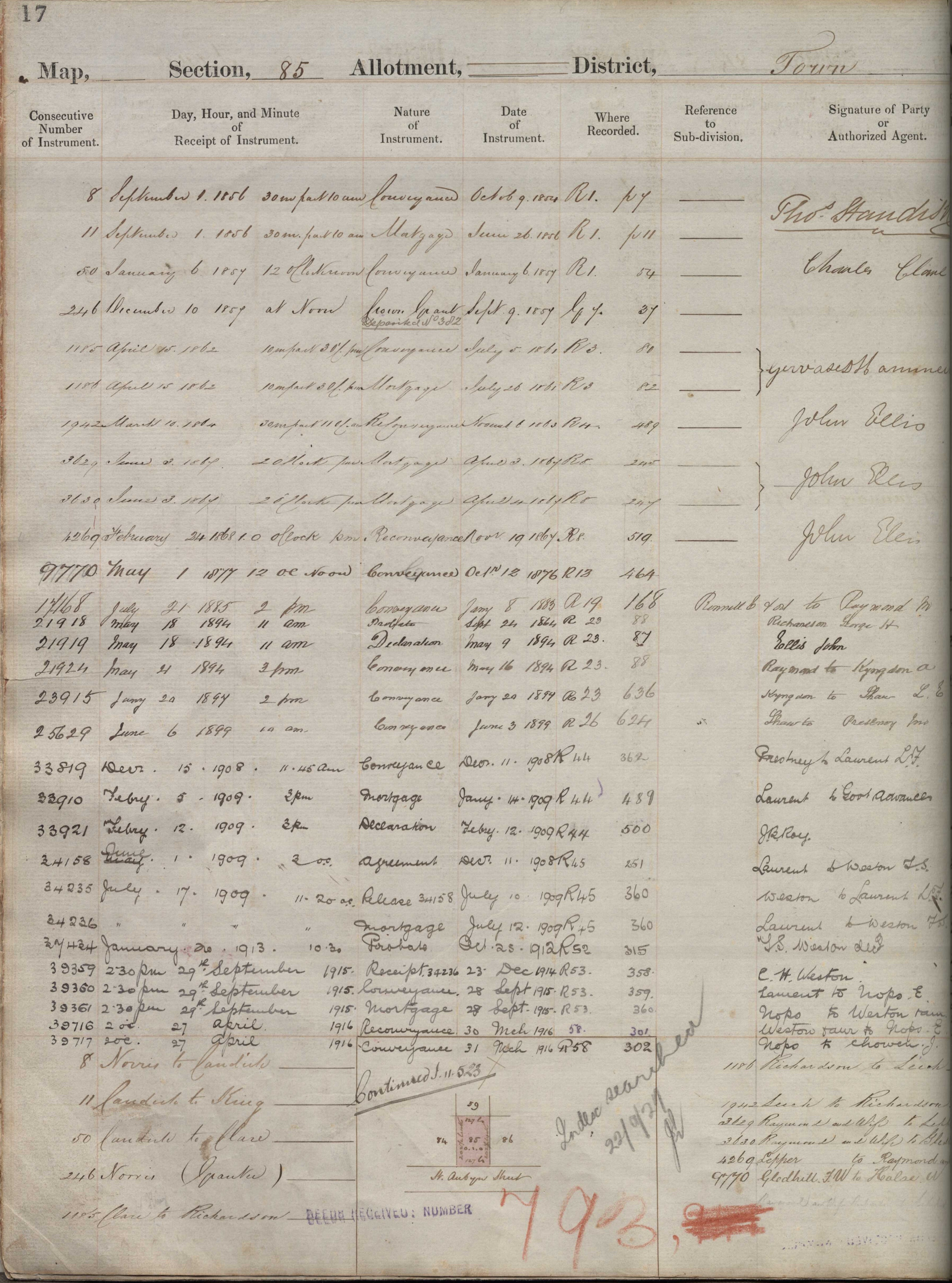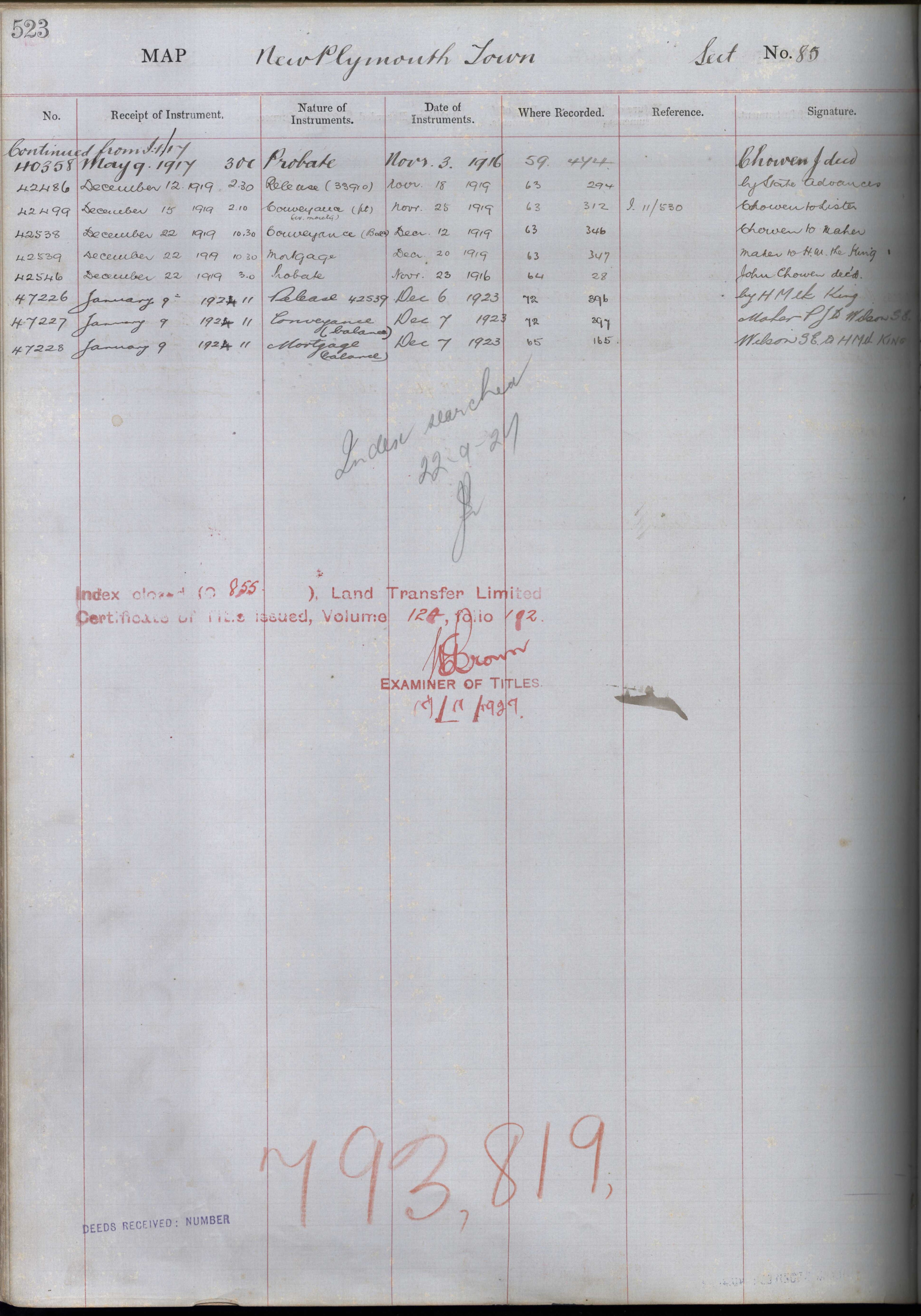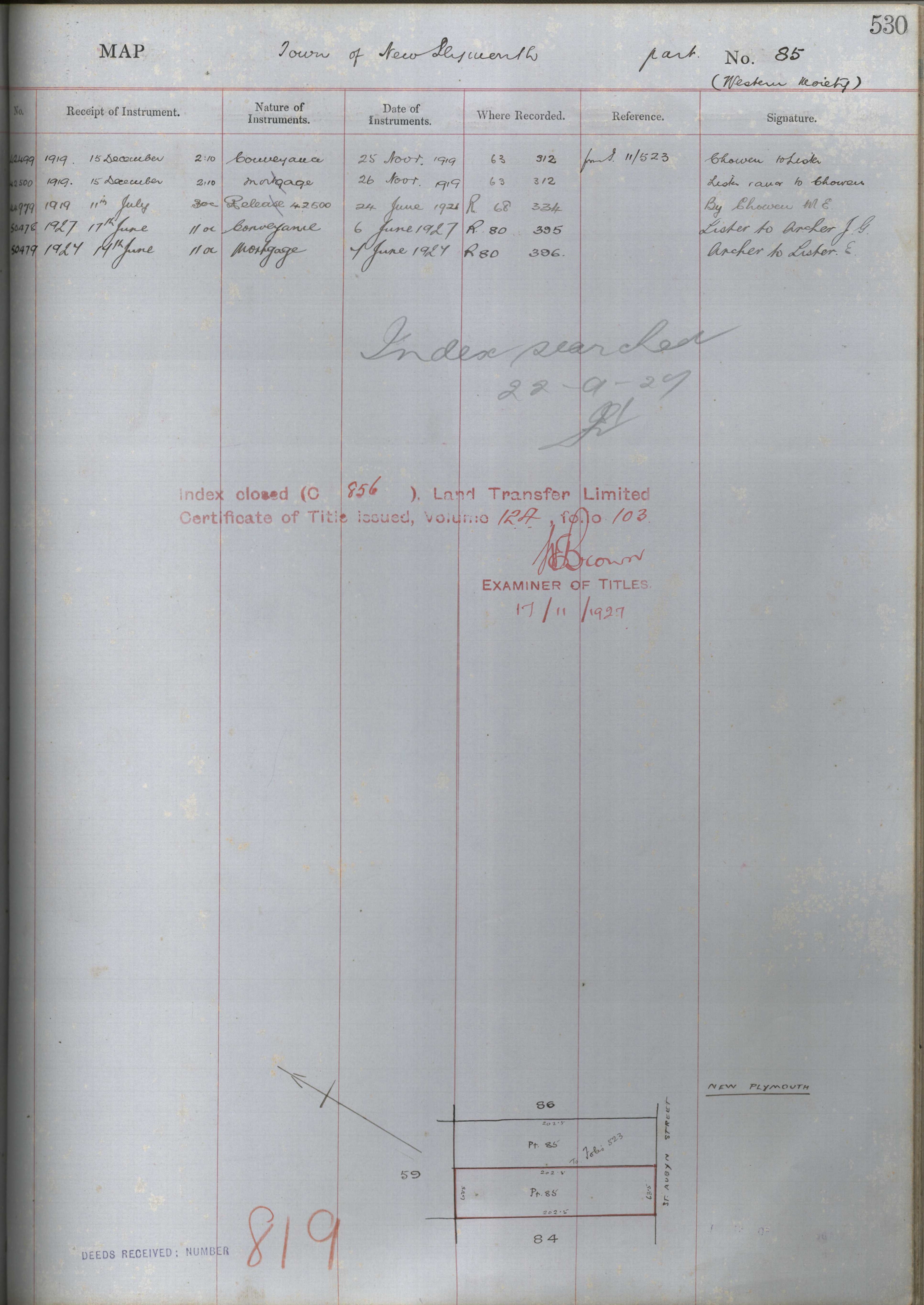 Town Section 85, Taranaki Land Deed Index I1 page 17, I11 page 523 and I11 page 530. (Archives New Zealand)