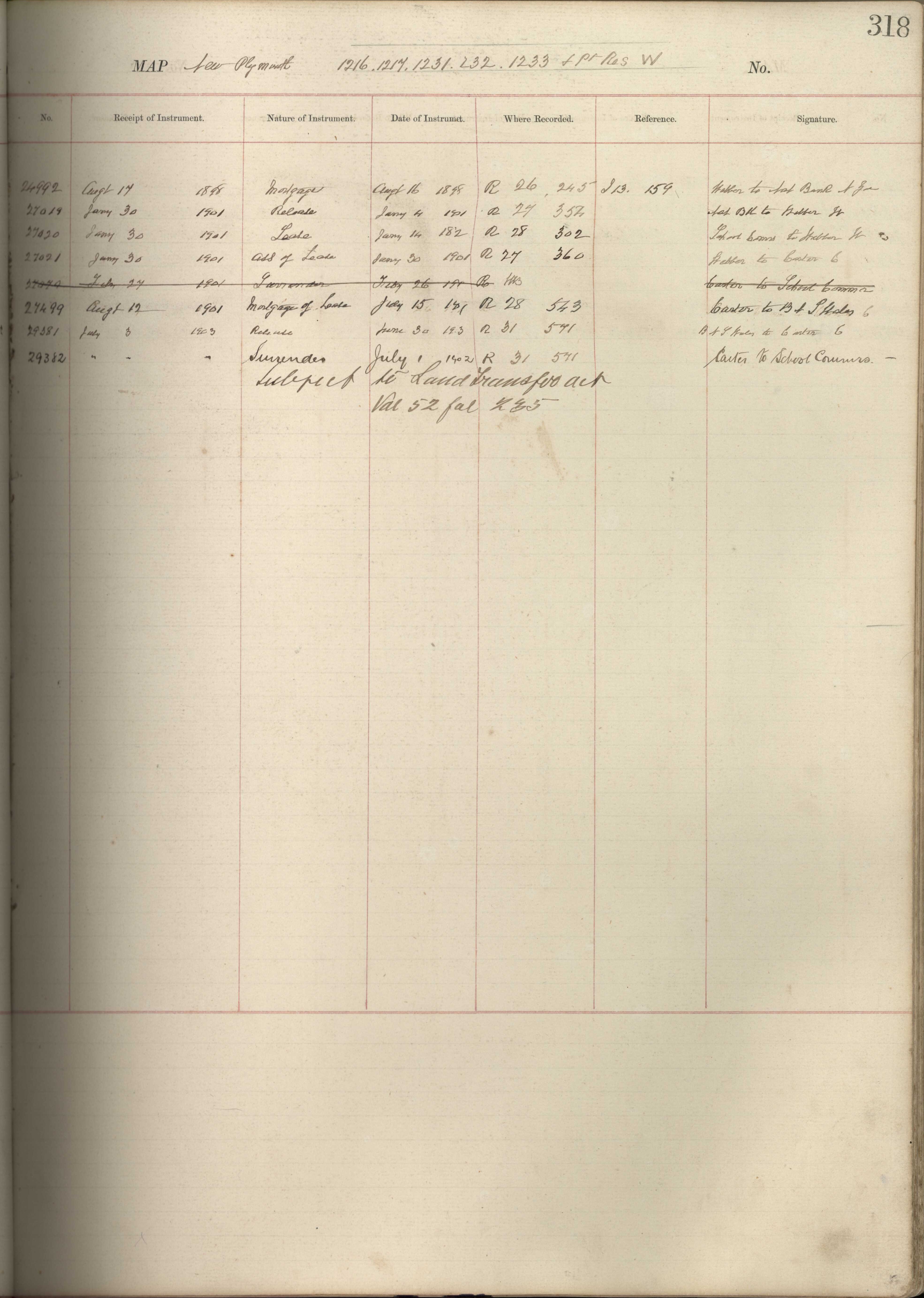 Town Section 1232, 1233 and part Town Belt W, Taranaki Land Deed Index I13 page 318. (Archives New Zealand)