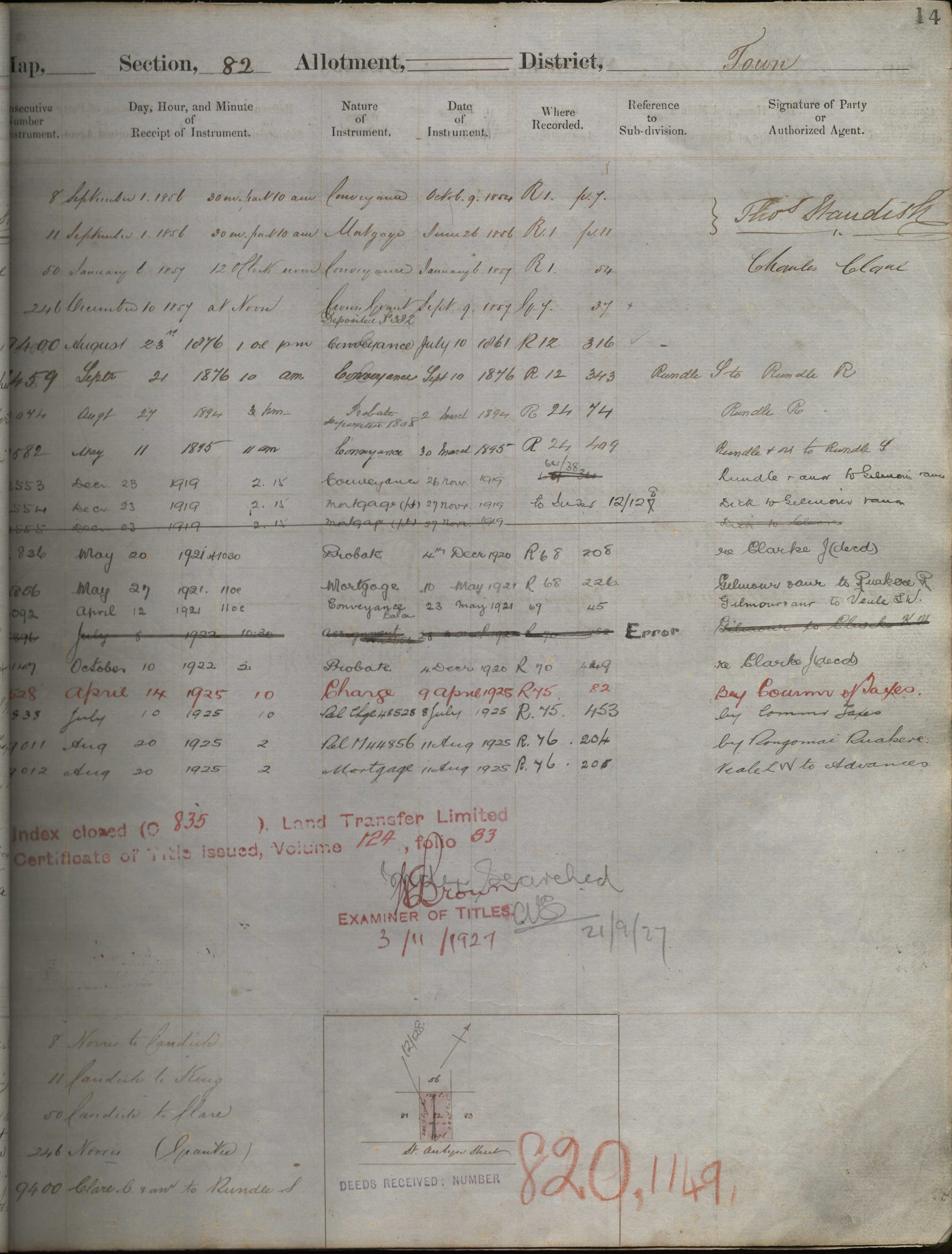 Town Section 82, Taranaki Land Deed Index I1 page 14. (Archives New Zealand)