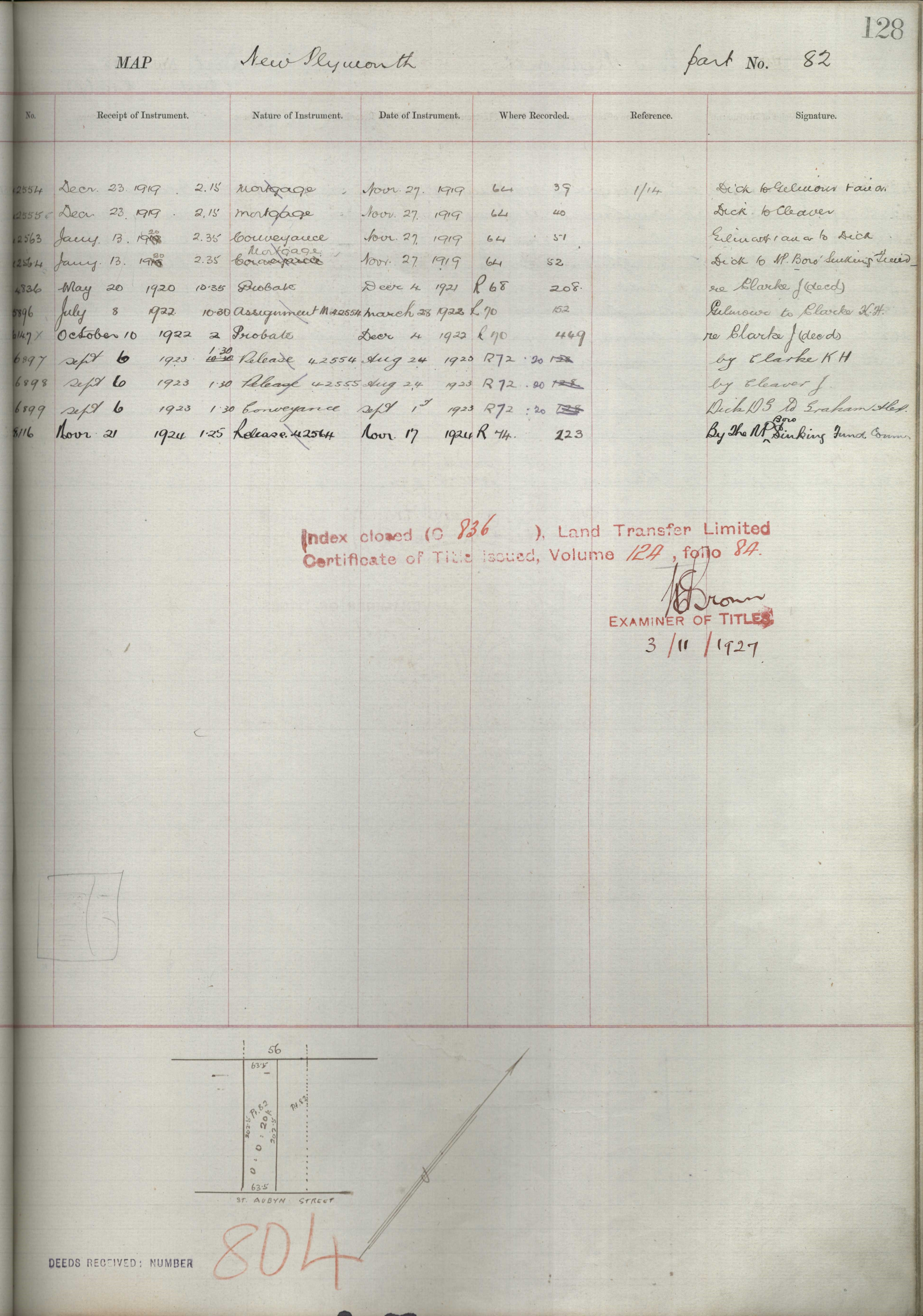 Town Section 82 (Part), Taranaki Land Deed Index I12 page 128. (Archives New Zealand)
