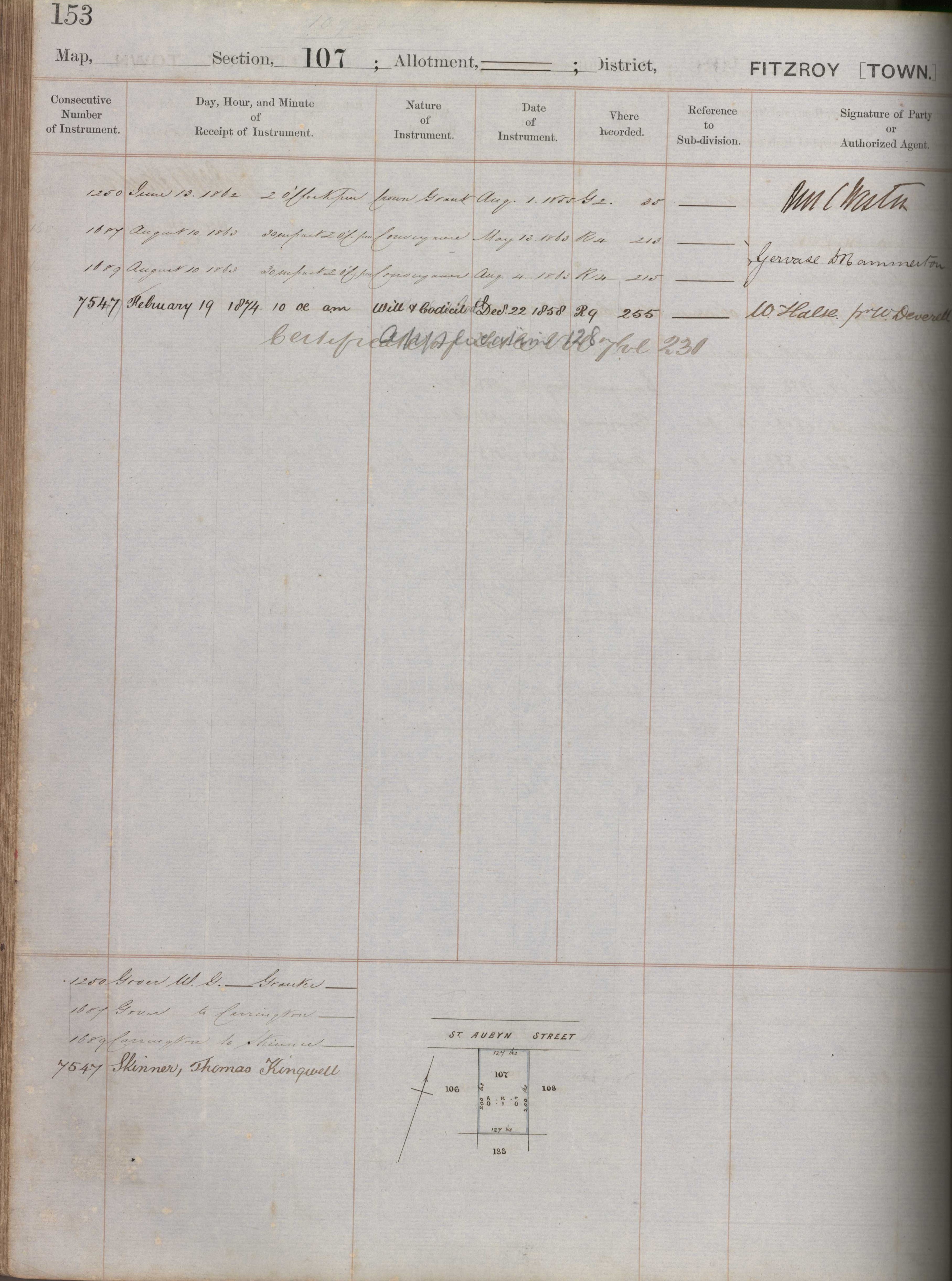 Town Section 107, Taranaki Land Deed Index I3 page 153. (Archives New Zealand)