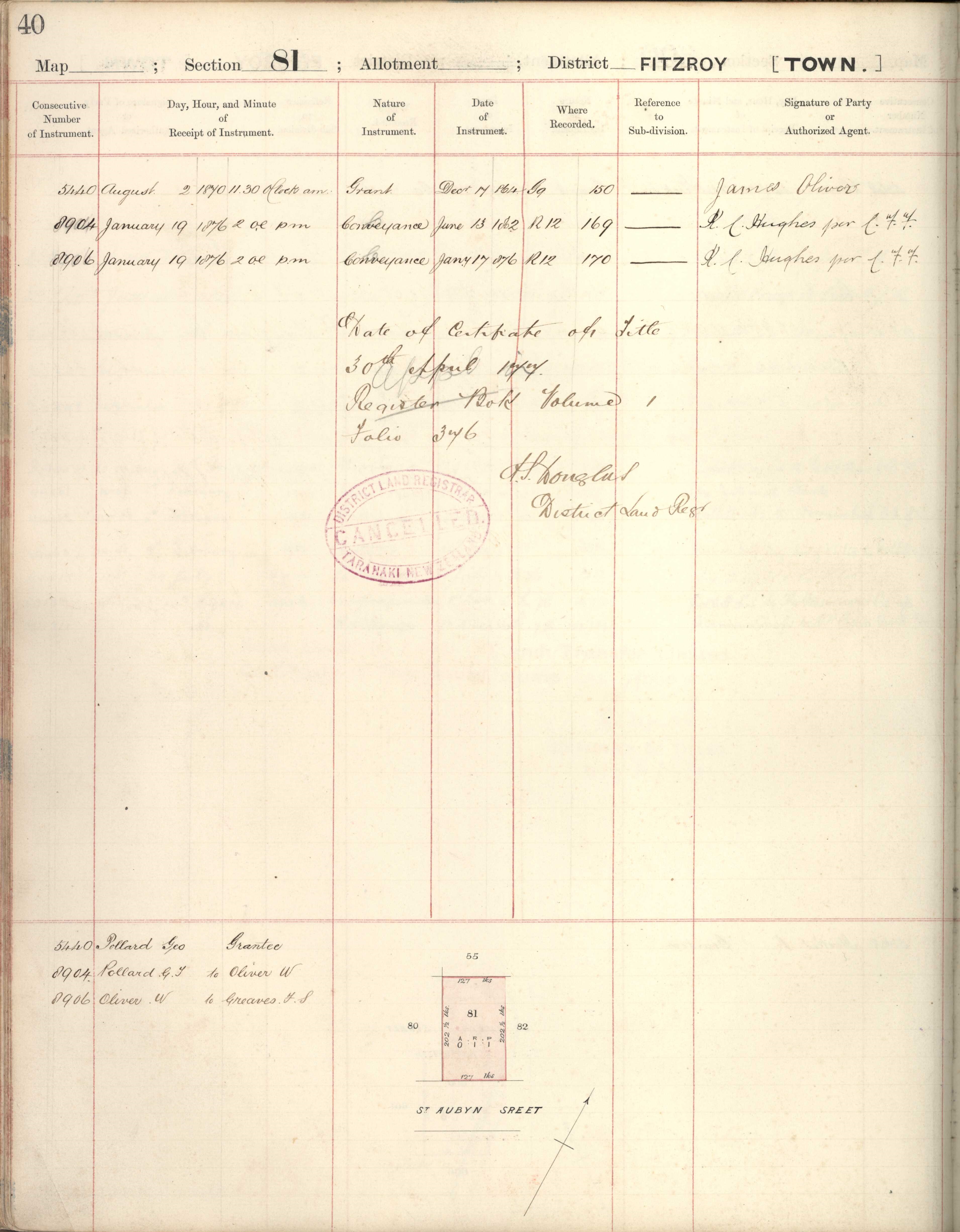 Town Section 81, Taranaki Land Deed Index I5 Page 40. (Archives New Zealand)
