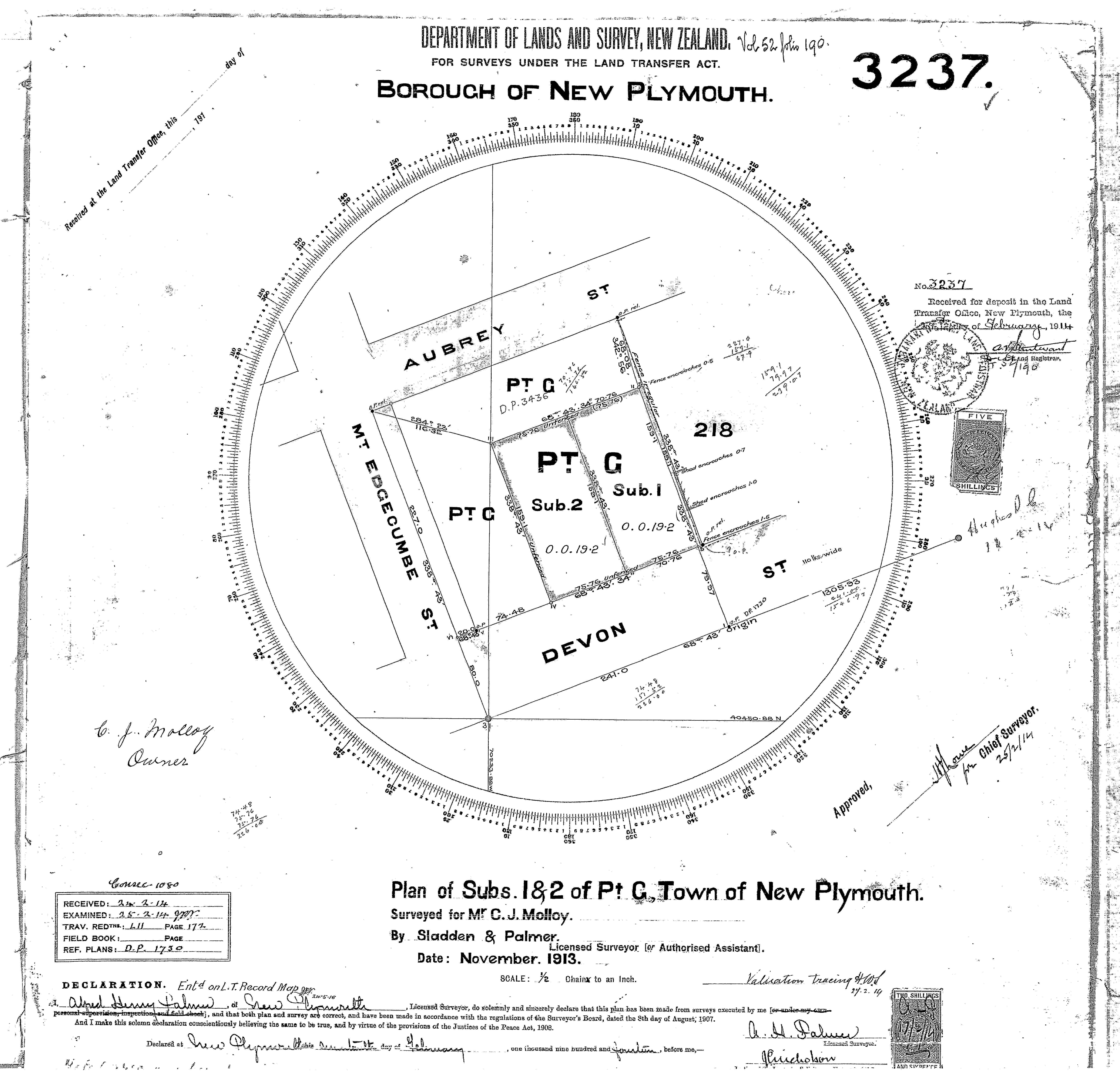 Taranaki (Lot 2) DP3237 Sheet 1 (1913), ICS Pre 300,000 Cadastral Plan Index (Imaged by LINZ)