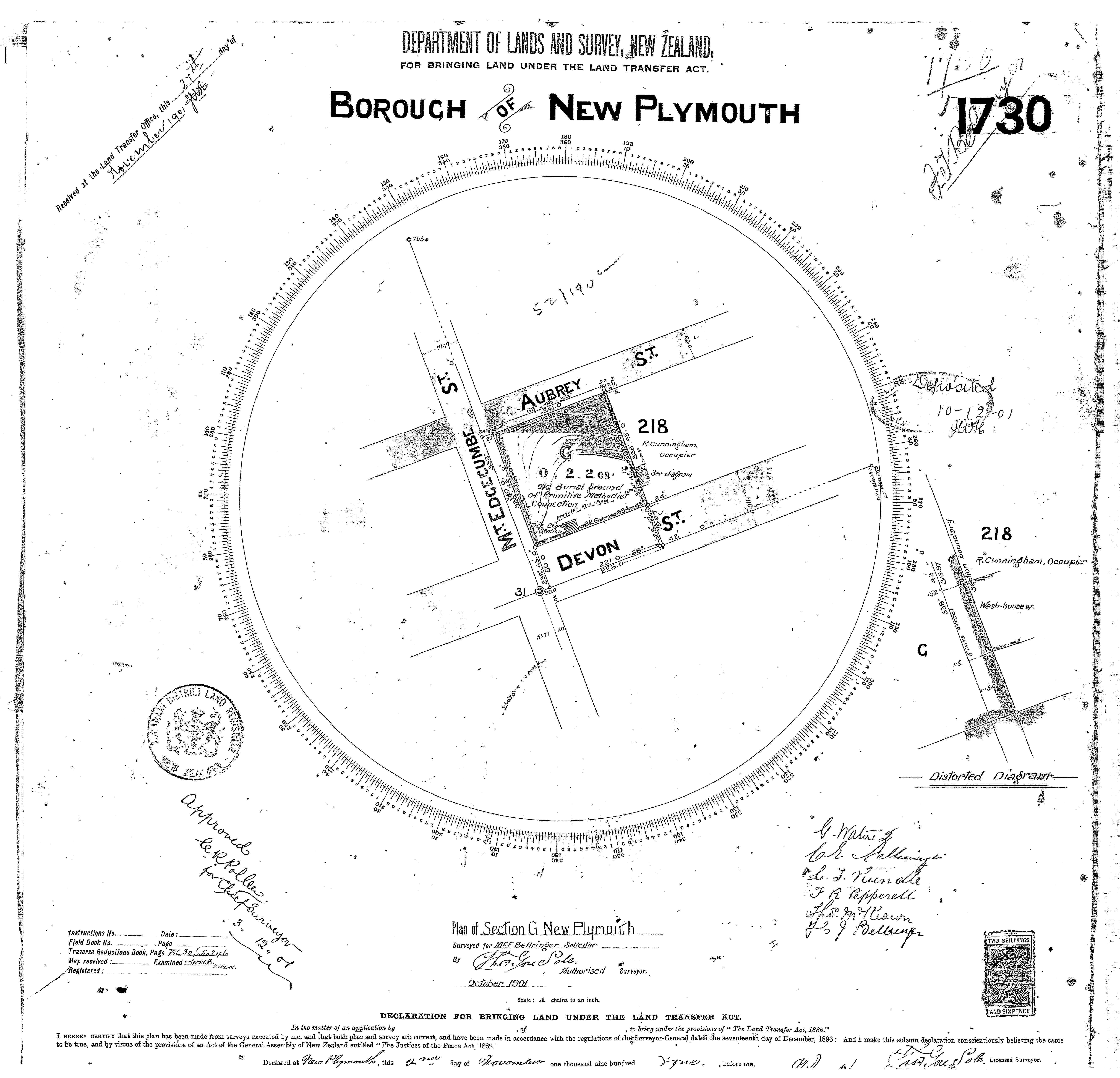 Town Reserve G was originally used as the Primitive Methodist Burial Ground. The cemetery was surveyed in 1901 (see DP1730) and brought under the Land Transfer Act. The reserve was later divided into smaller lots.