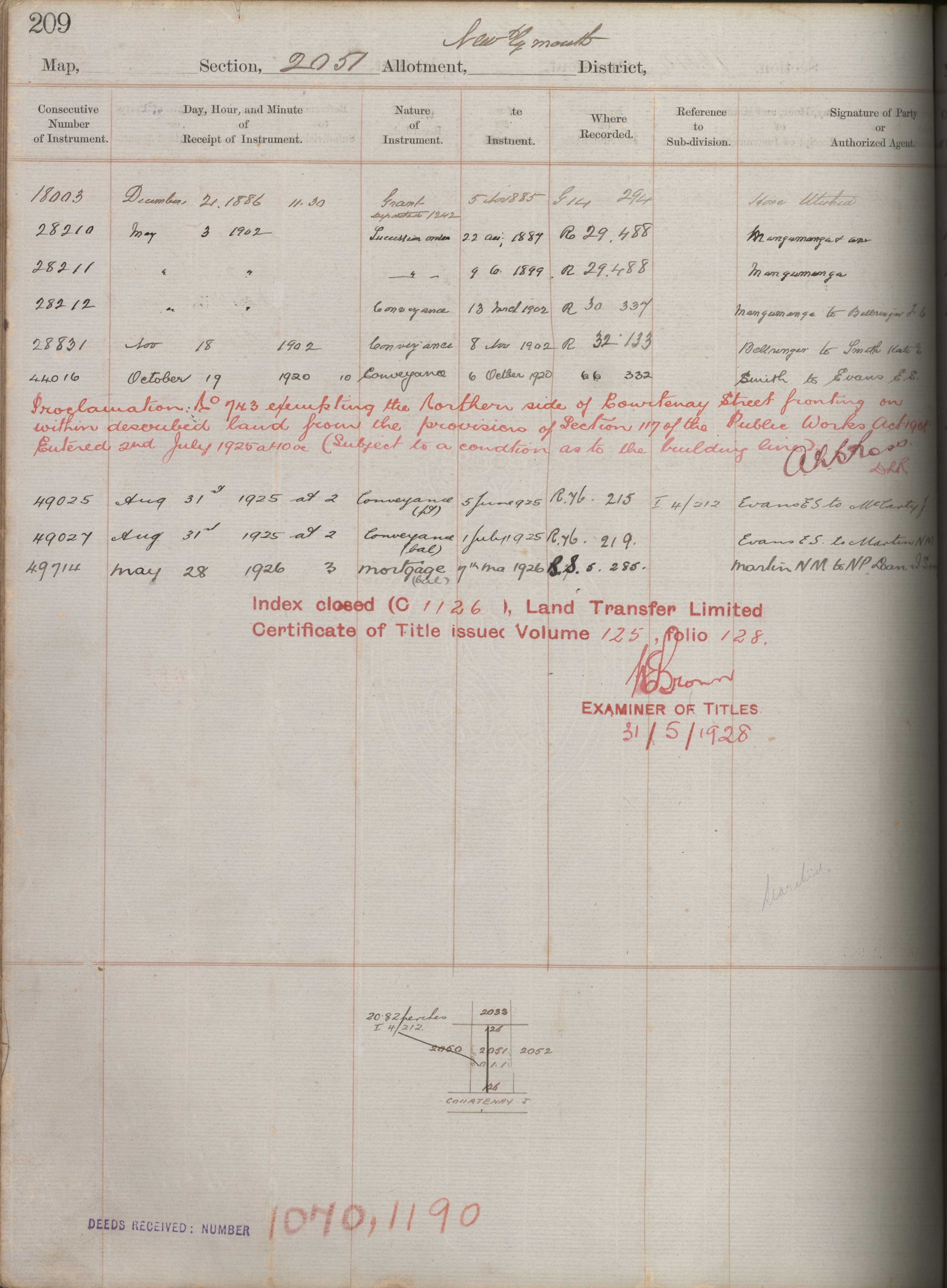 Town Section 2051, Taranaki Land Deed Index I4 page 209. (Archives New Zealand)