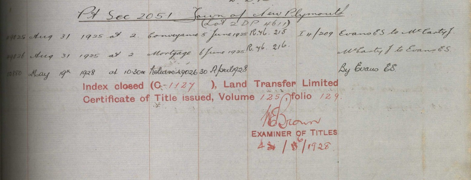 Town Section (Part) 2051, Taranaki Land Deed Index I4 page 212. (Archives New Zealand)