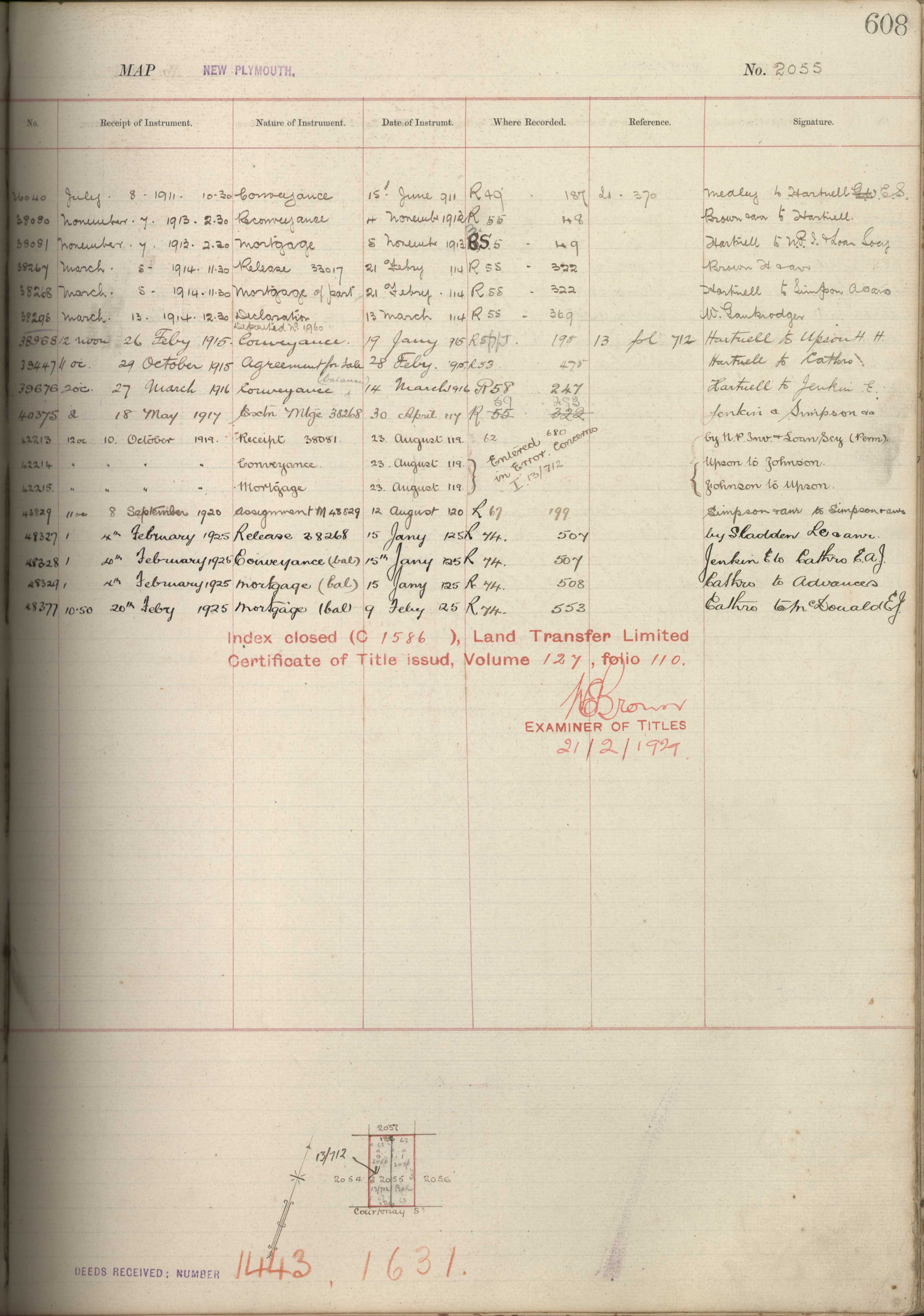 Town Section (Part) 2055, Taranaki Land Deed Index I13 page 608. (Archives New Zealand)