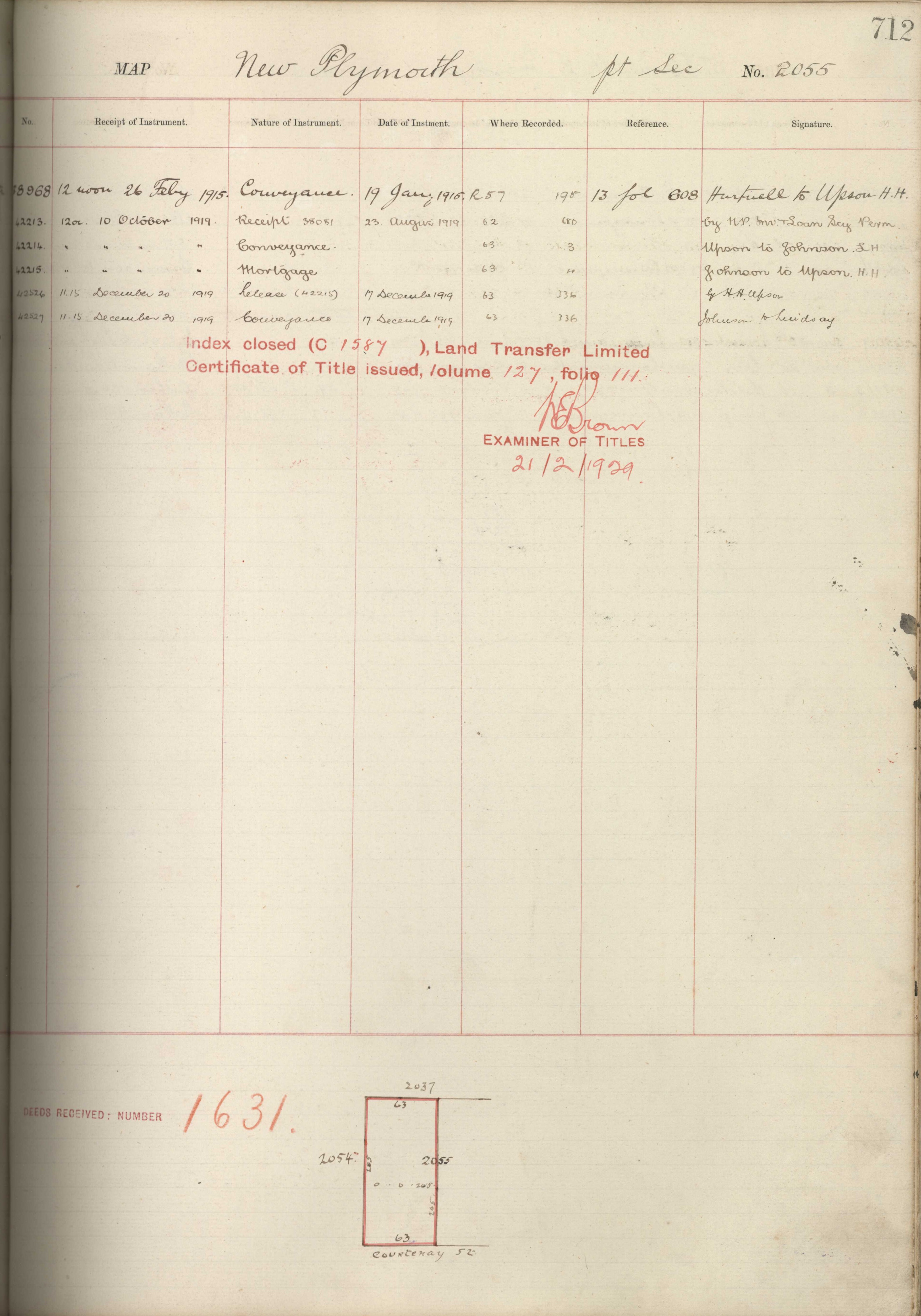 Town Section (Part) 2055, Taranaki Land Deed Index I13 Page 712. (Archives New Zealand)