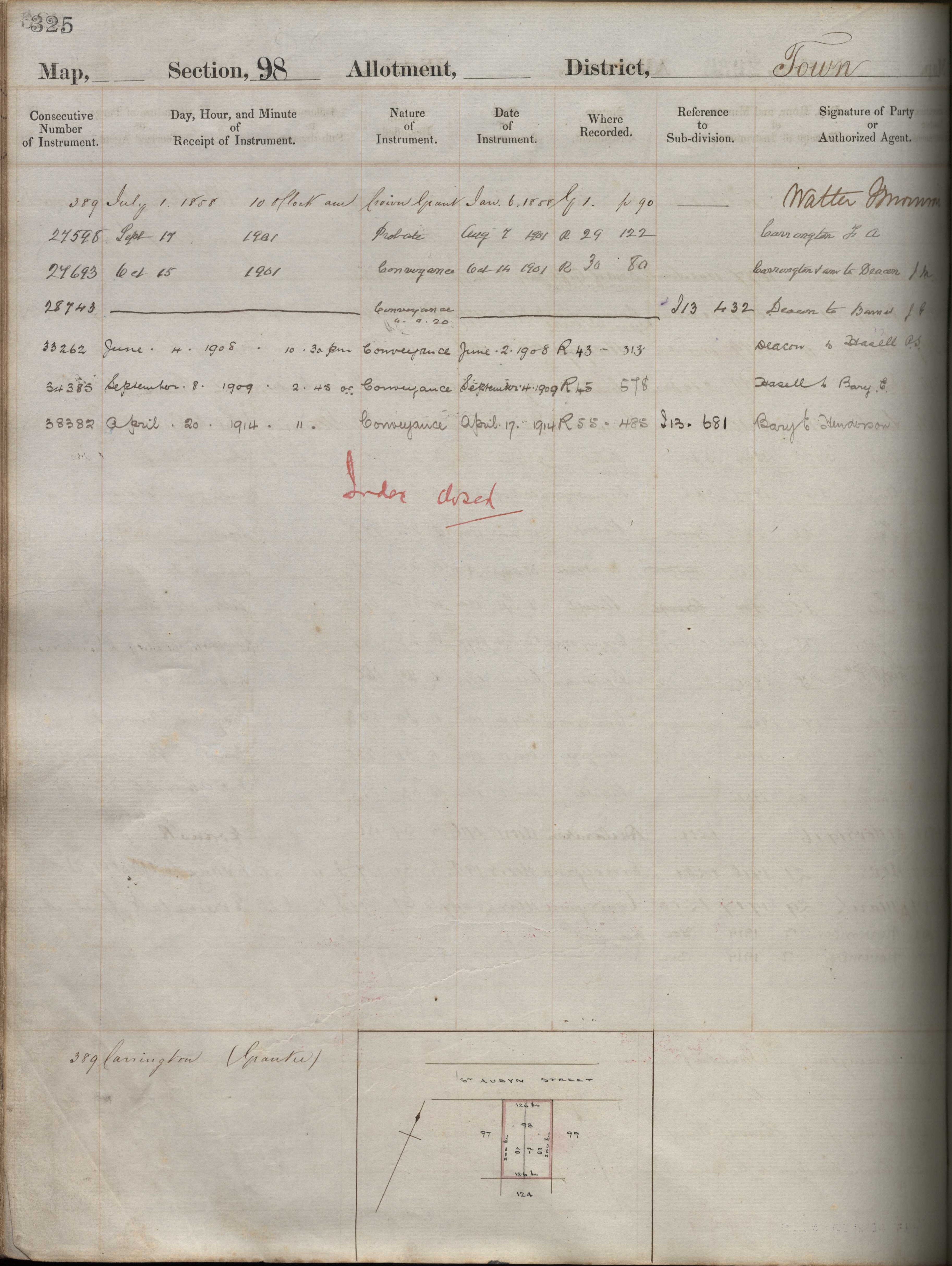 Town Section 98, Taranaki Land Deed Index I1 page 325. (Archives New Zealand)