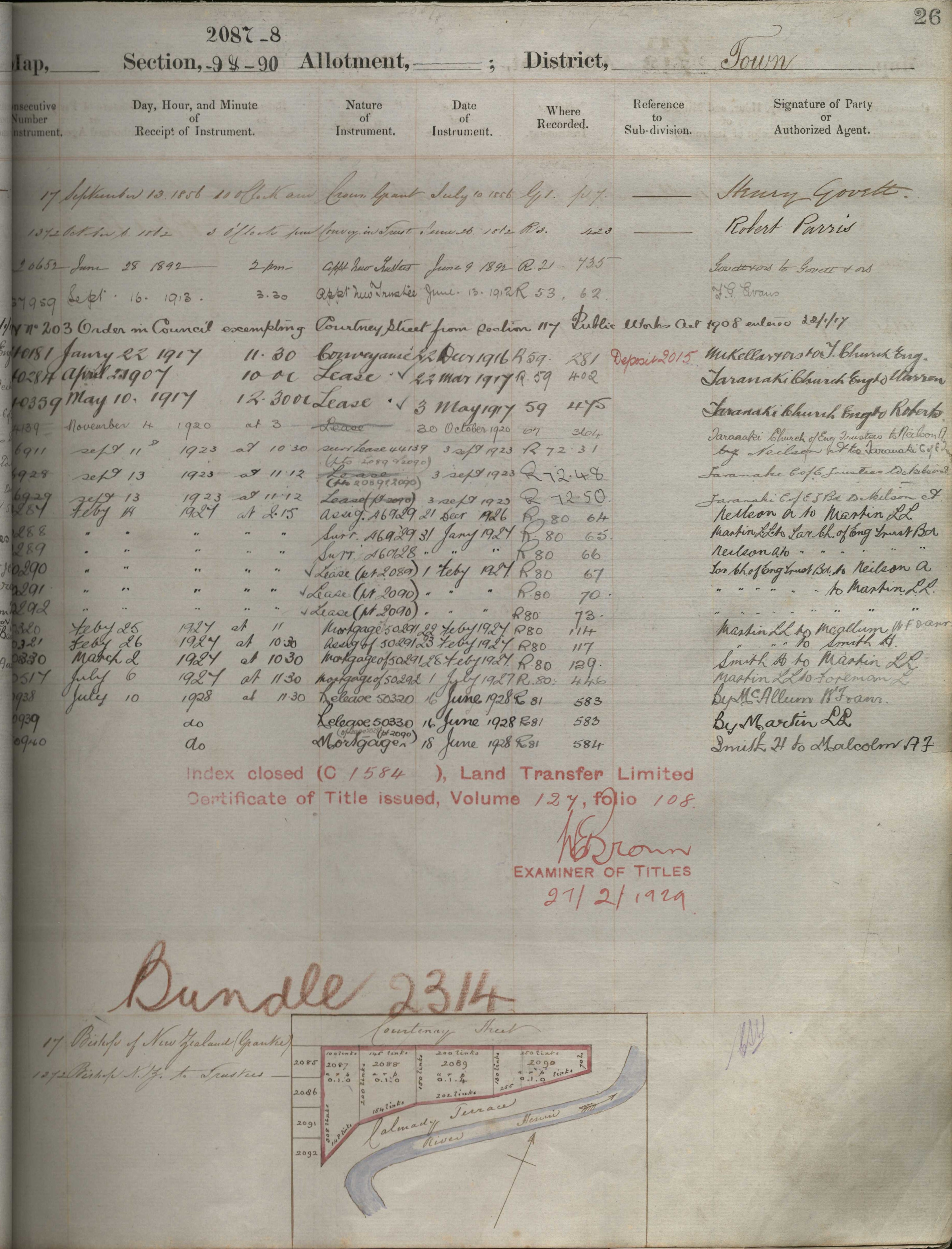 Town Section 2087, Taranaki Land Deed Index I1 page 26. (Archives New Zealand)