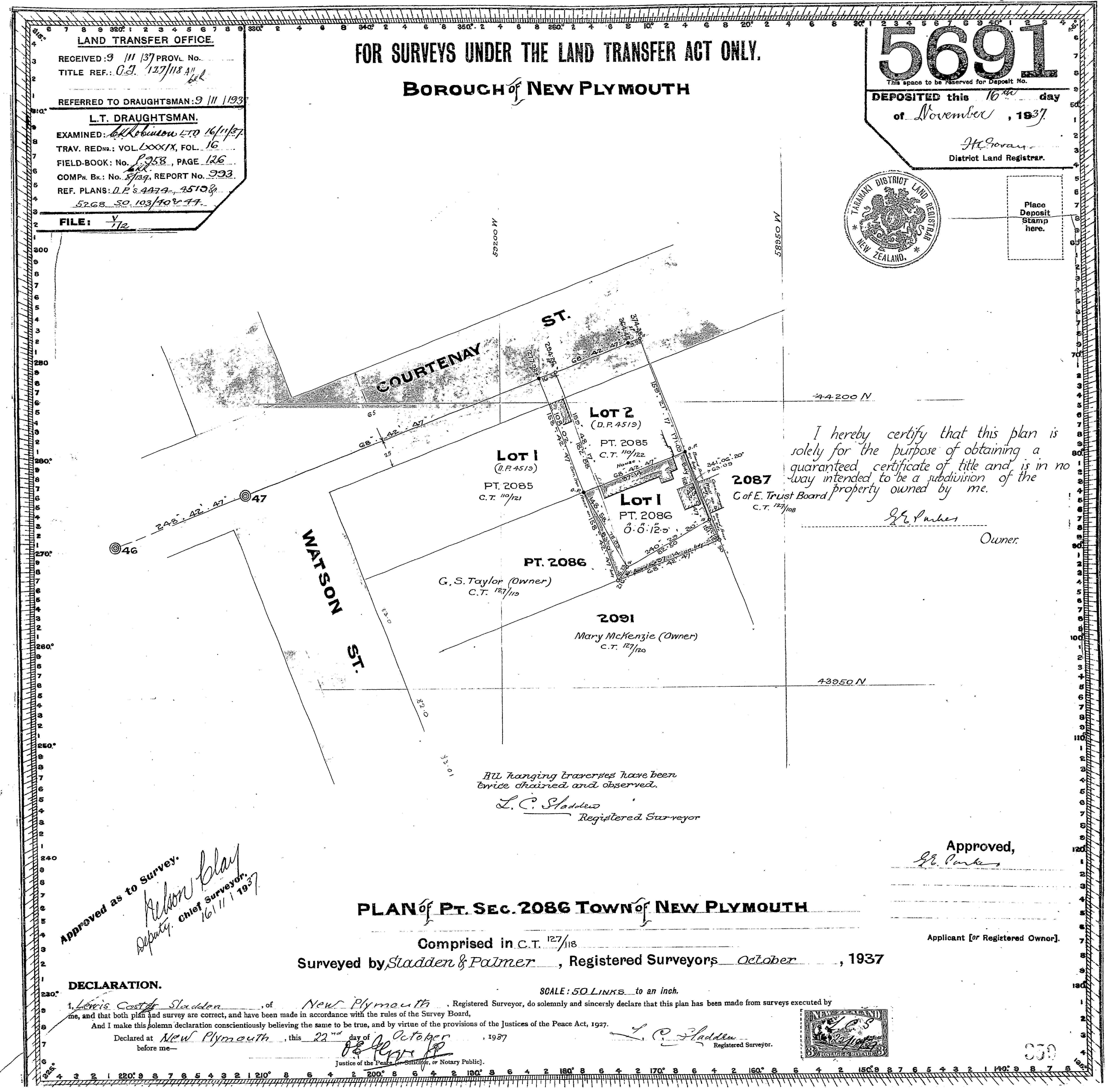 Taranaki DP5691 Sheet 1 (1937), ICS Pre 300,000 Cadastral Plan Index (Imaged by LINZ)