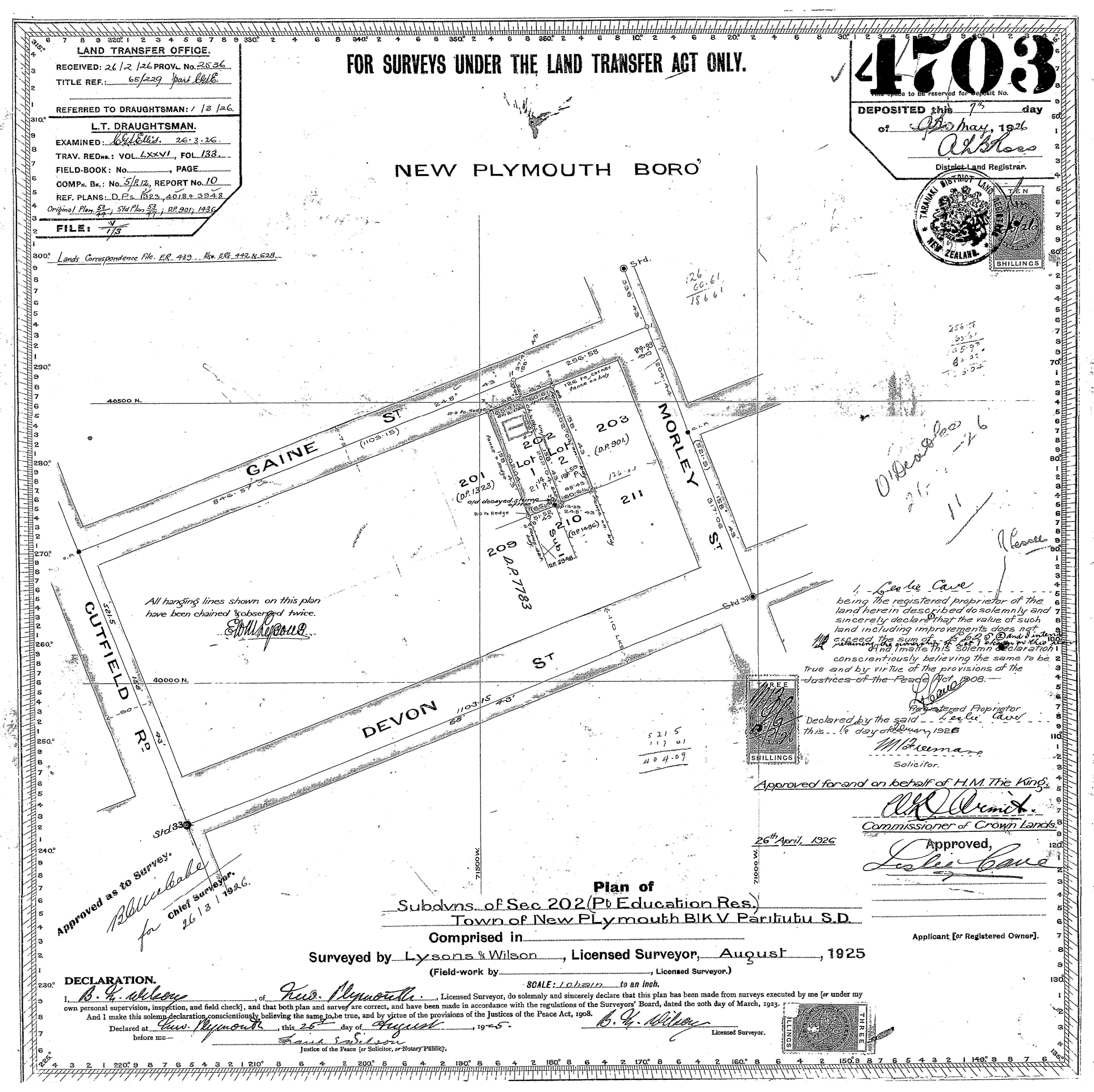 Taranaki (Lot 2) DP4703 Sheet 1 (1925), ICS Pre 300,000 Cadastral Plan Index (Imaged by LINZ)