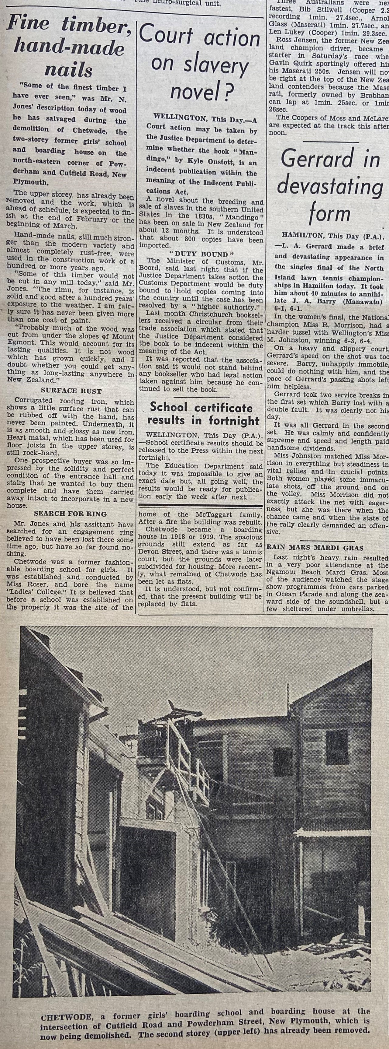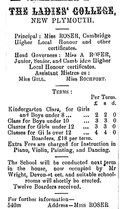 The site had previously been home to Chetwode School. Originally established by Miss Margaret Roser in 1893 and known as 'New Plymouth Ladies' College', it was the only private girls' boarding school in New Plymouth and charged £18 per term. Miss Edith Owen Stanford (1865-1946) took over in January 1898 and by the end of that year the name had changed to Chetwode School. Miss Stanford ran the school until it's closure on 28 January 1919, when it merged with St Mary's Diocesan School for Girls in Stratford. Pupils at Chetwode were offered an education in subjects including music, languages, scripture, drawing and gardening and held regular reunions for many years.