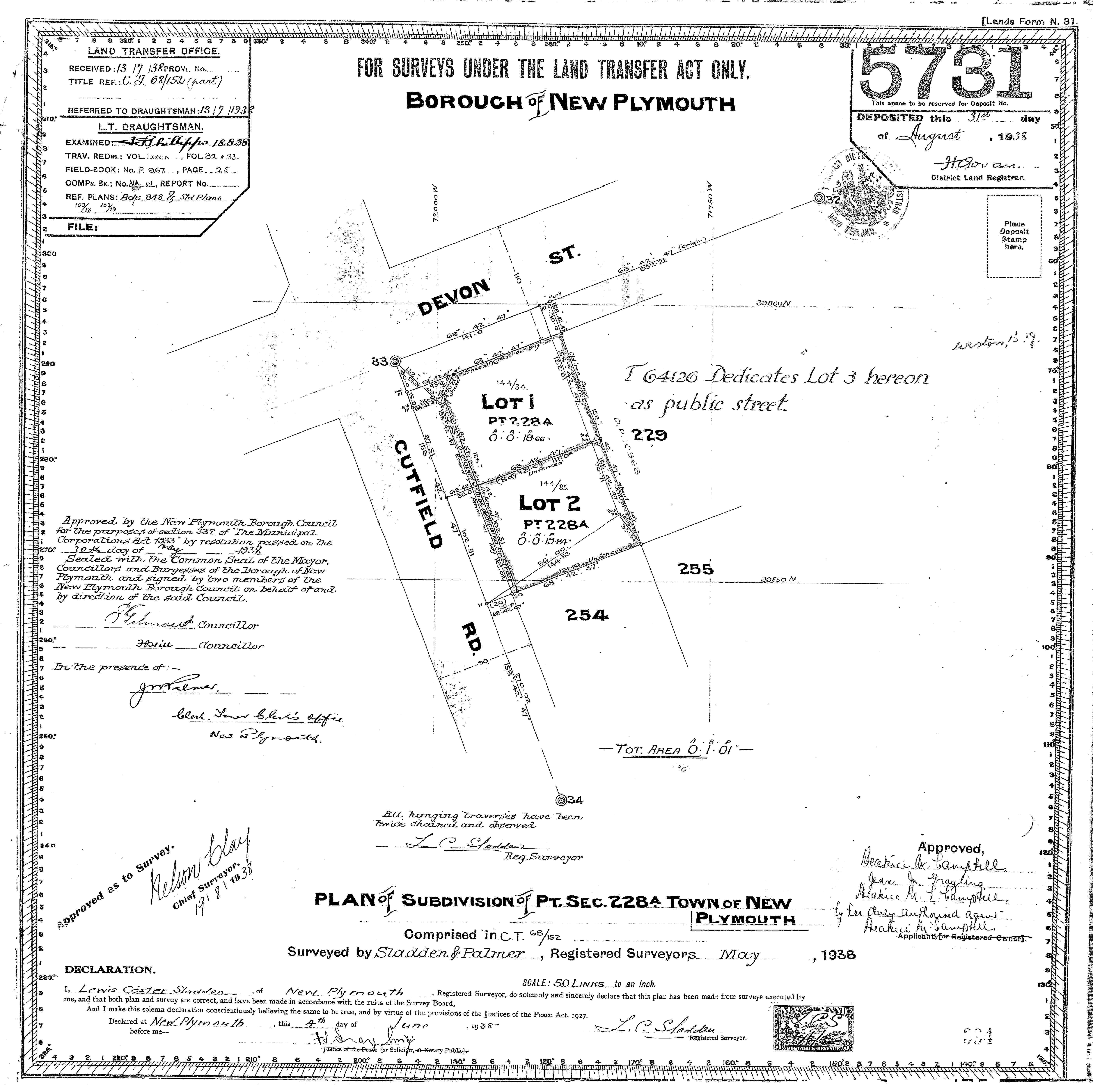 Taranaki (Lot 1) DP5731 Sheet 1 (1938), ICS Pre 300,000 Cadastral Plan Index (Imaged by LINZ)