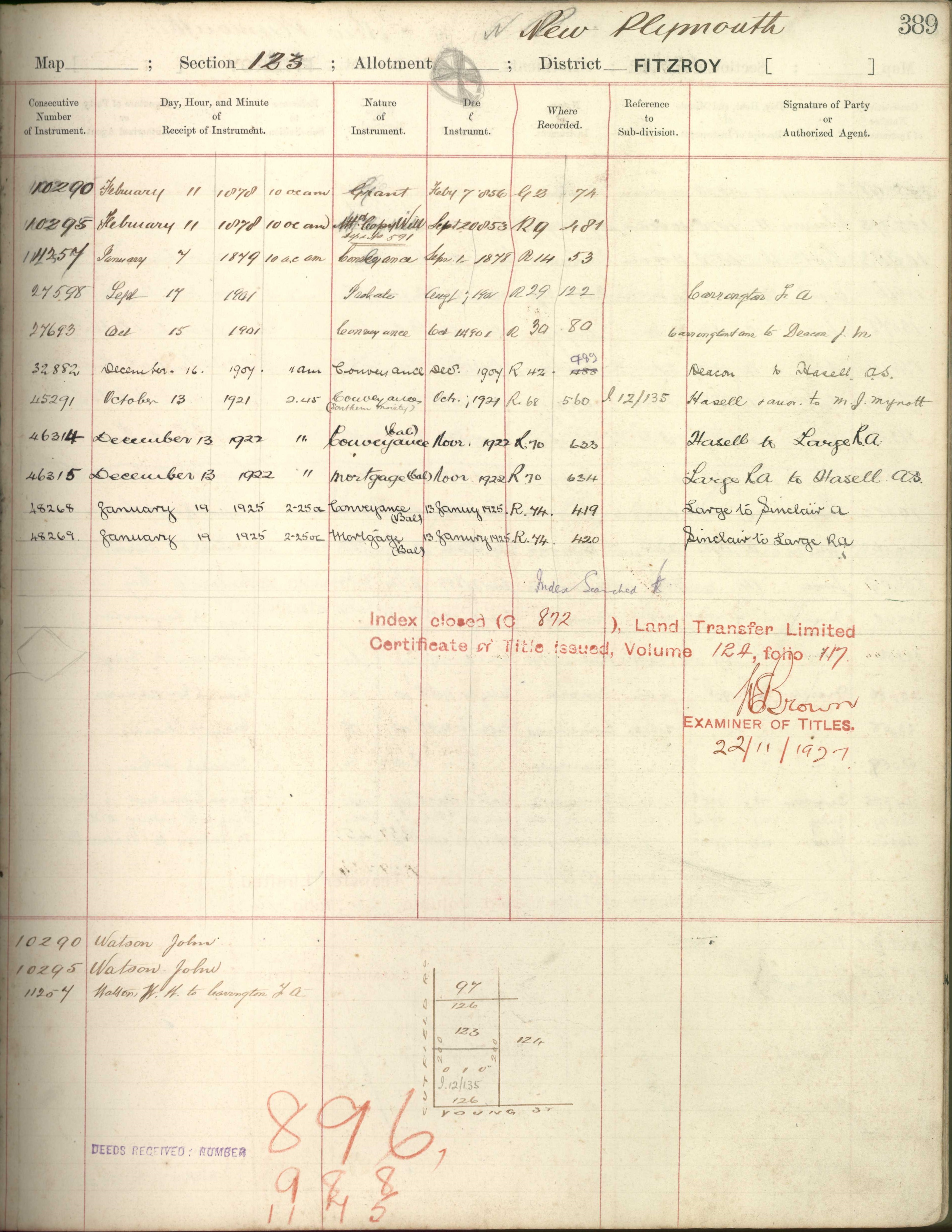 Town Section 123, Taranaki Land Deed Index I5 Page 389. (Archives New Zealand)