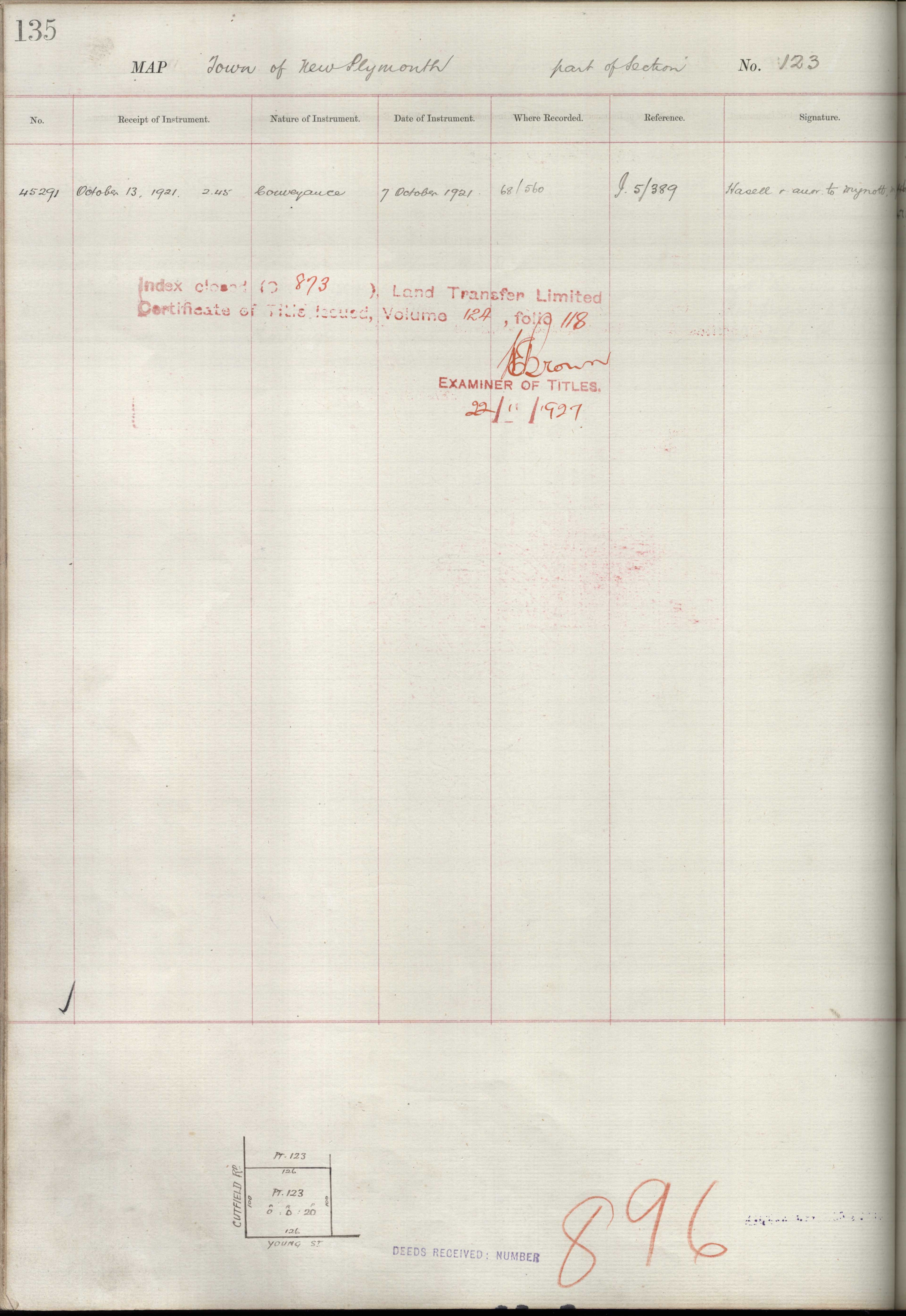 Town Section (Part) 123, Taranaki Land Deed Index I12 Page 135. (Archives New Zealand)