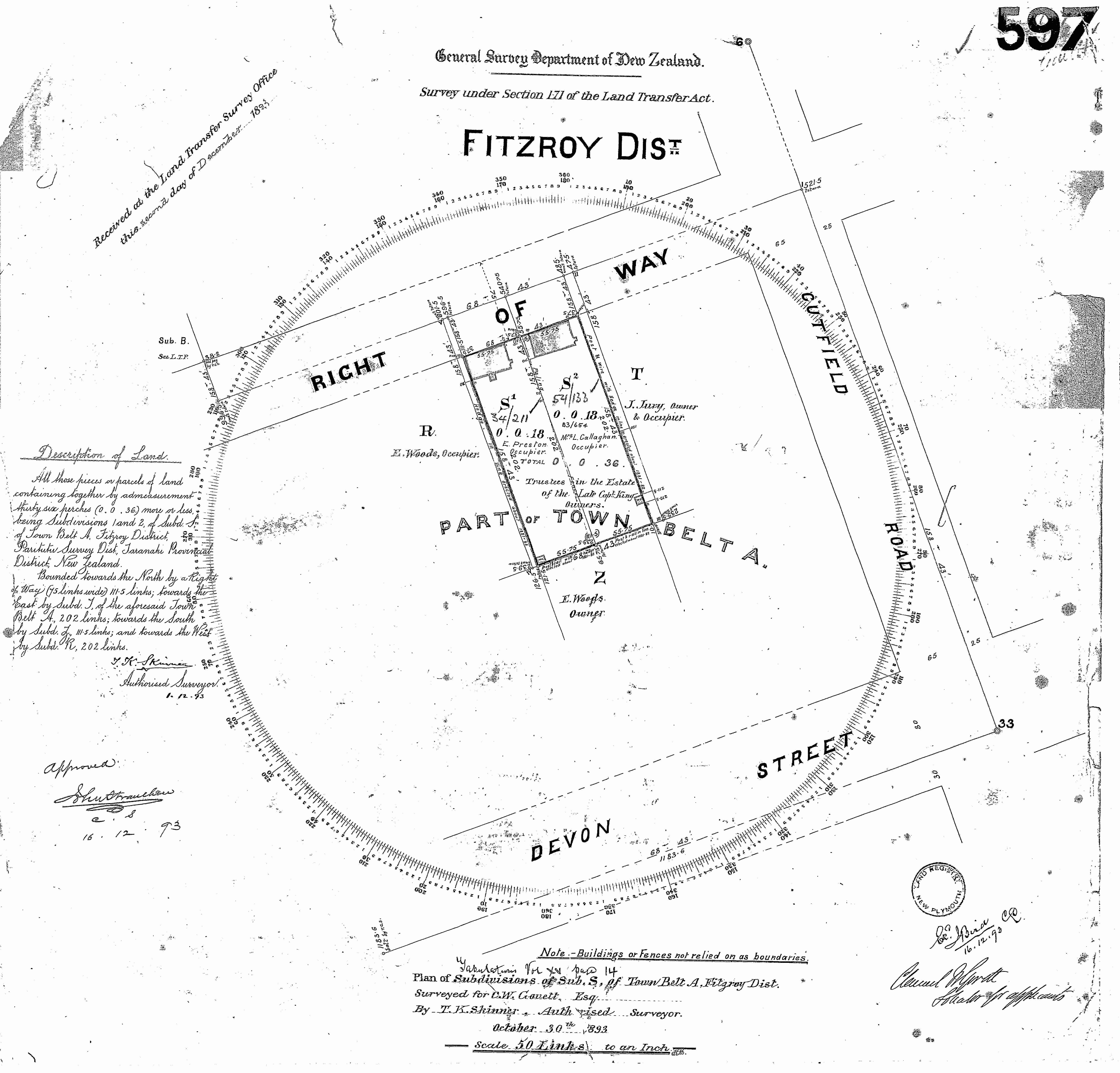 Taranaki (Lot S2) DP597 Sheet 1 (1893), ICS Pre 300,000 Cadastral Plan Index (Imaged by LINZ)