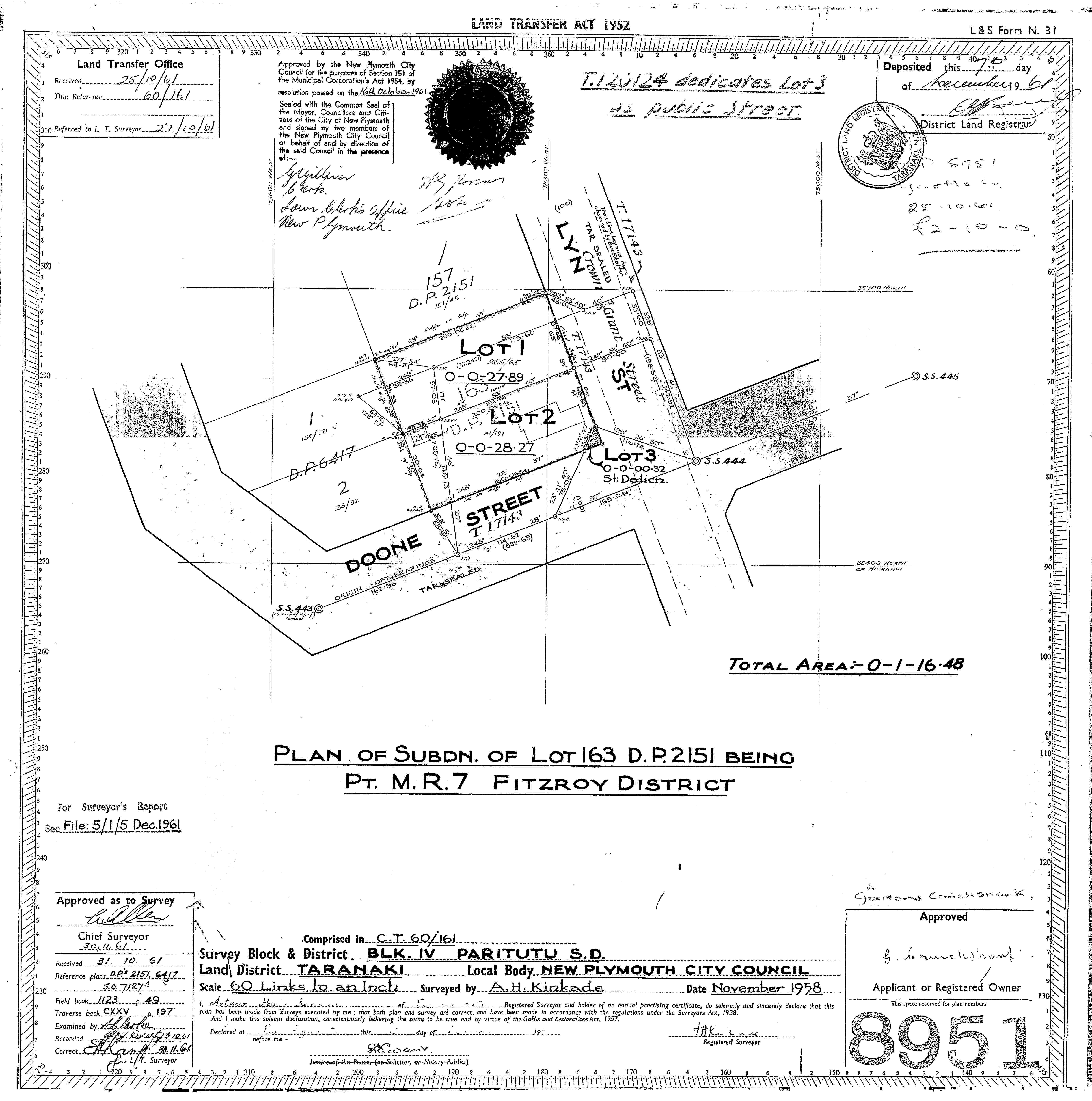 Taranaki (Lot 163) DP2151 Sheet 1 (1904), ICS Pre 300,000 Cadastral Plan Index (Imaged by LINZ)