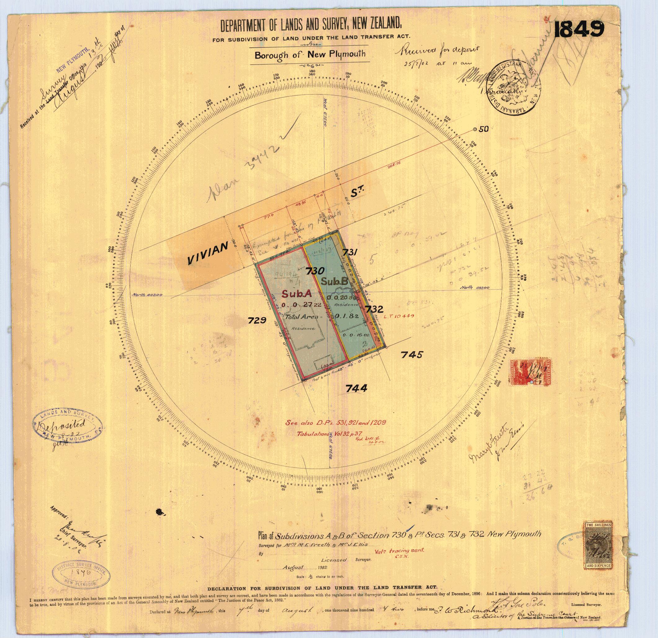 Taranaki DP1849 Sheet 1 (1902), ICS Pre 300,000 Cadastral Plan Index (Imaged by LINZ)