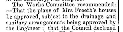 In August 1900 it was reported by the Borough Council "that the plans of Mrs Freeth's houses be approved, subject to the drainage and sanitary arrangements being approved by the Engineer". Mrs Freeth is first listed as the ratepayer for Town Section 731 in the 1901-02 rating year, and at this time, three houses are listed as being present on the section, and the property had a value of £96.