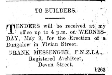 The home was very likely designed by notable New Plymouth architect Frank Messenger, who called for tenders for the construction of a 'bungalow' in Vivian Street, in late April 1917 - this was probably one of the last homes Messenger designed before entering into partnership with Victor Griffiths in early June 1917.