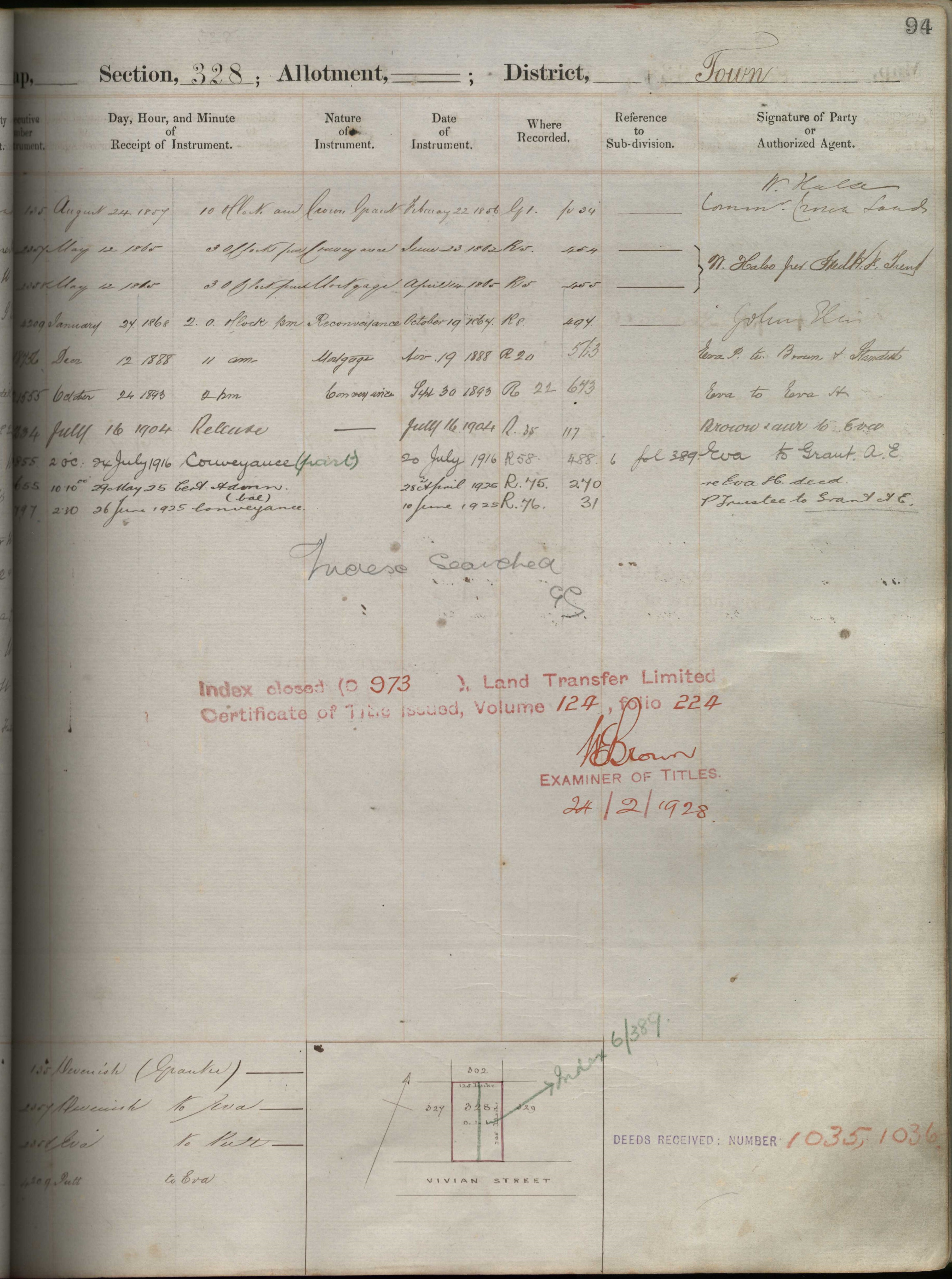 Town Section 328, Taranaki Land Deed Index I1 page 94. (Archives New Zealand)