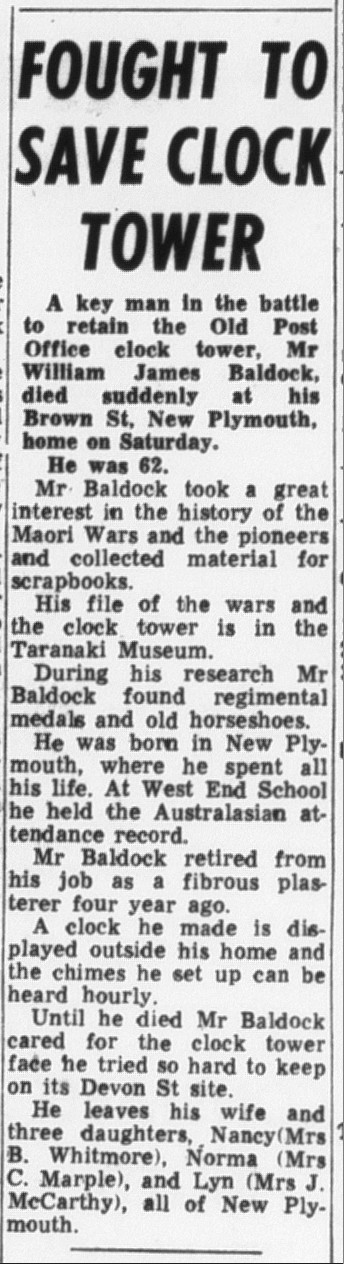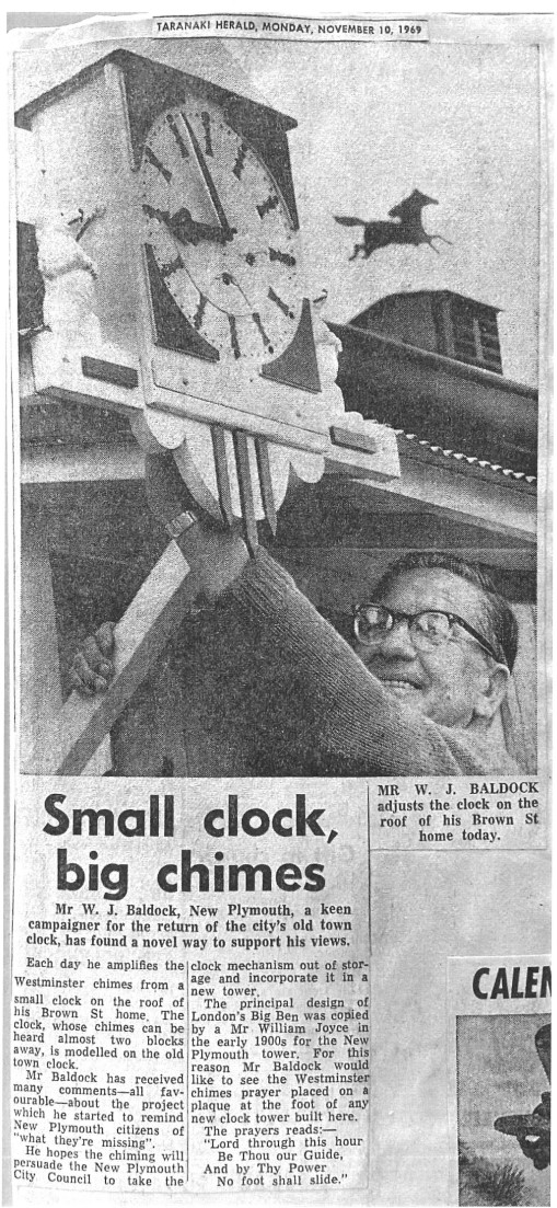 Baldock was also a passionate advocate for the rebuilding of the New Plymouth clocktower after its demolition. He installed a chiming clock above his front door (modelled on the old town clock), said to be heard, "almost two blocks away".