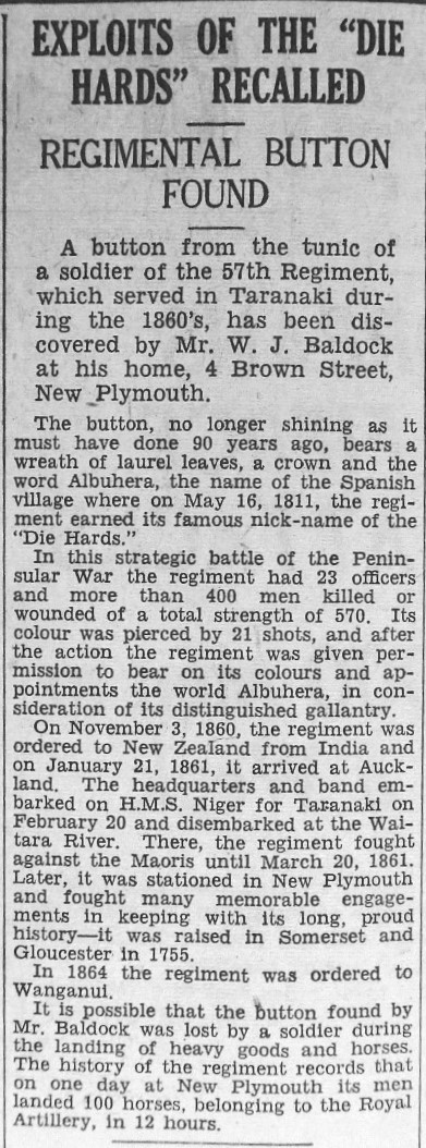 Exploits of the "Diehards" Recalled : Regimental Button Found (Taranaki Herald 13 October 1952)