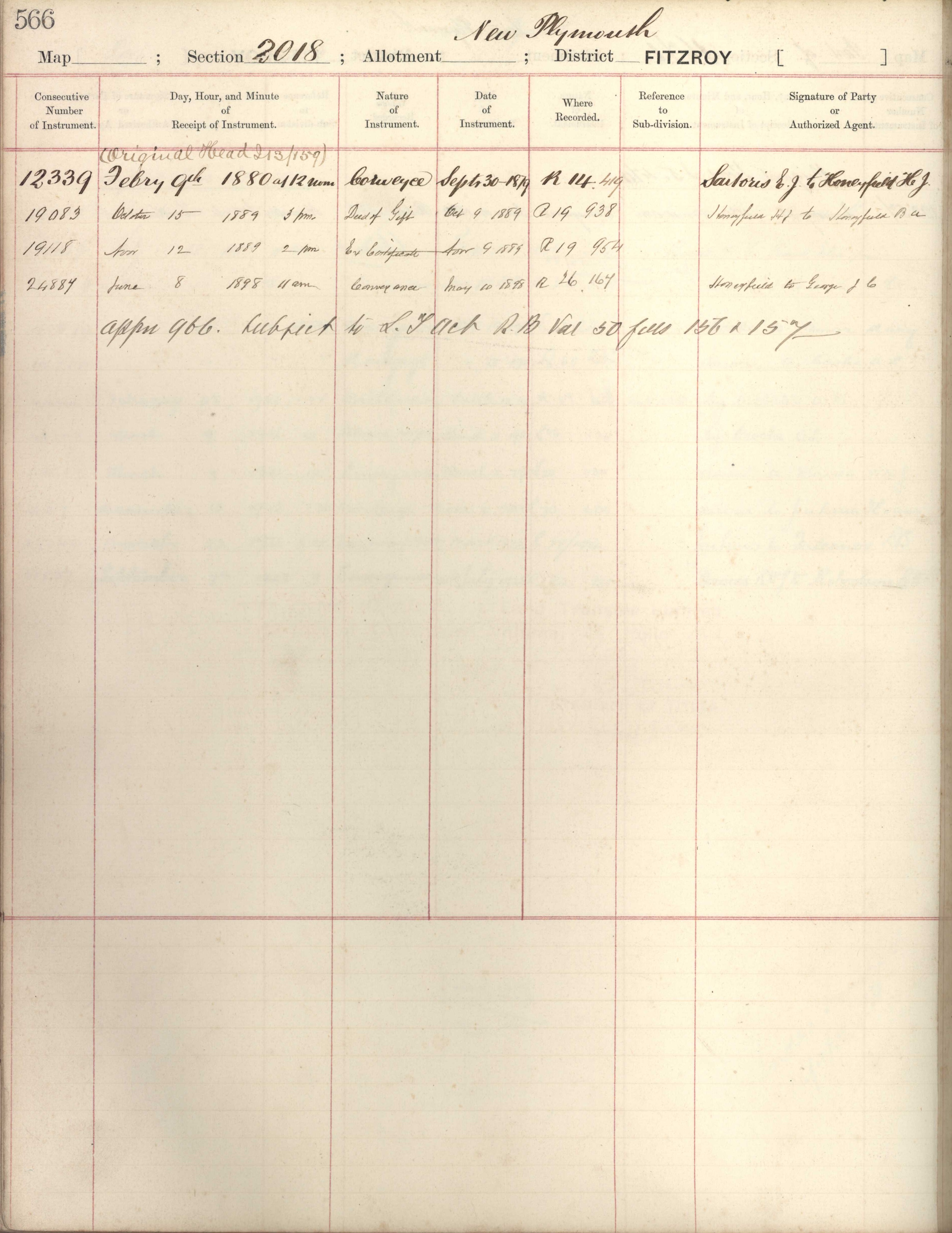 Town Section 2018, Taranaki Land Deed Index I5 Page 566. (Archives New Zealand)