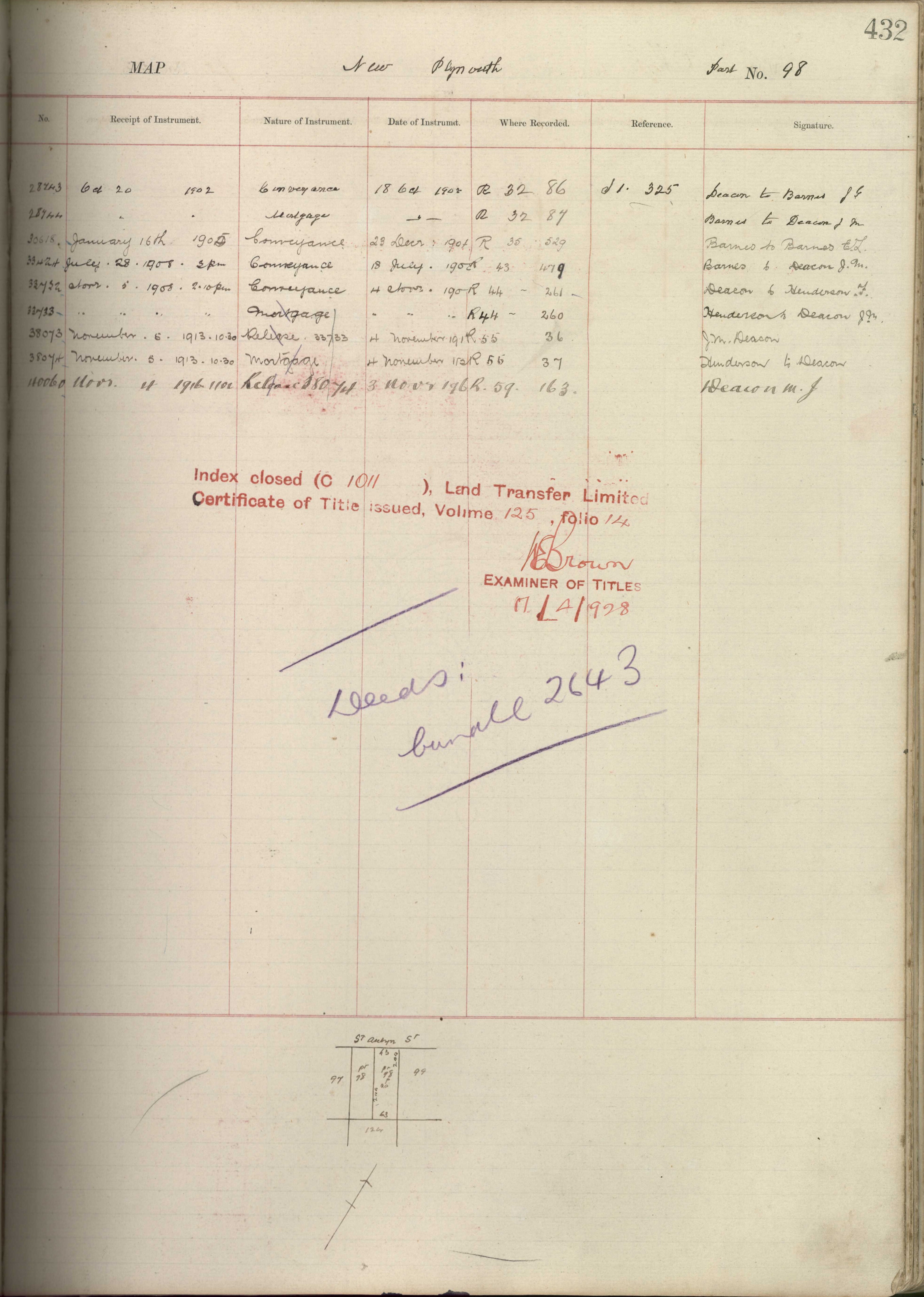 Town section (Part) 98, Taranaki Land Deed Index I13 page 432. (Archives New Zealand)