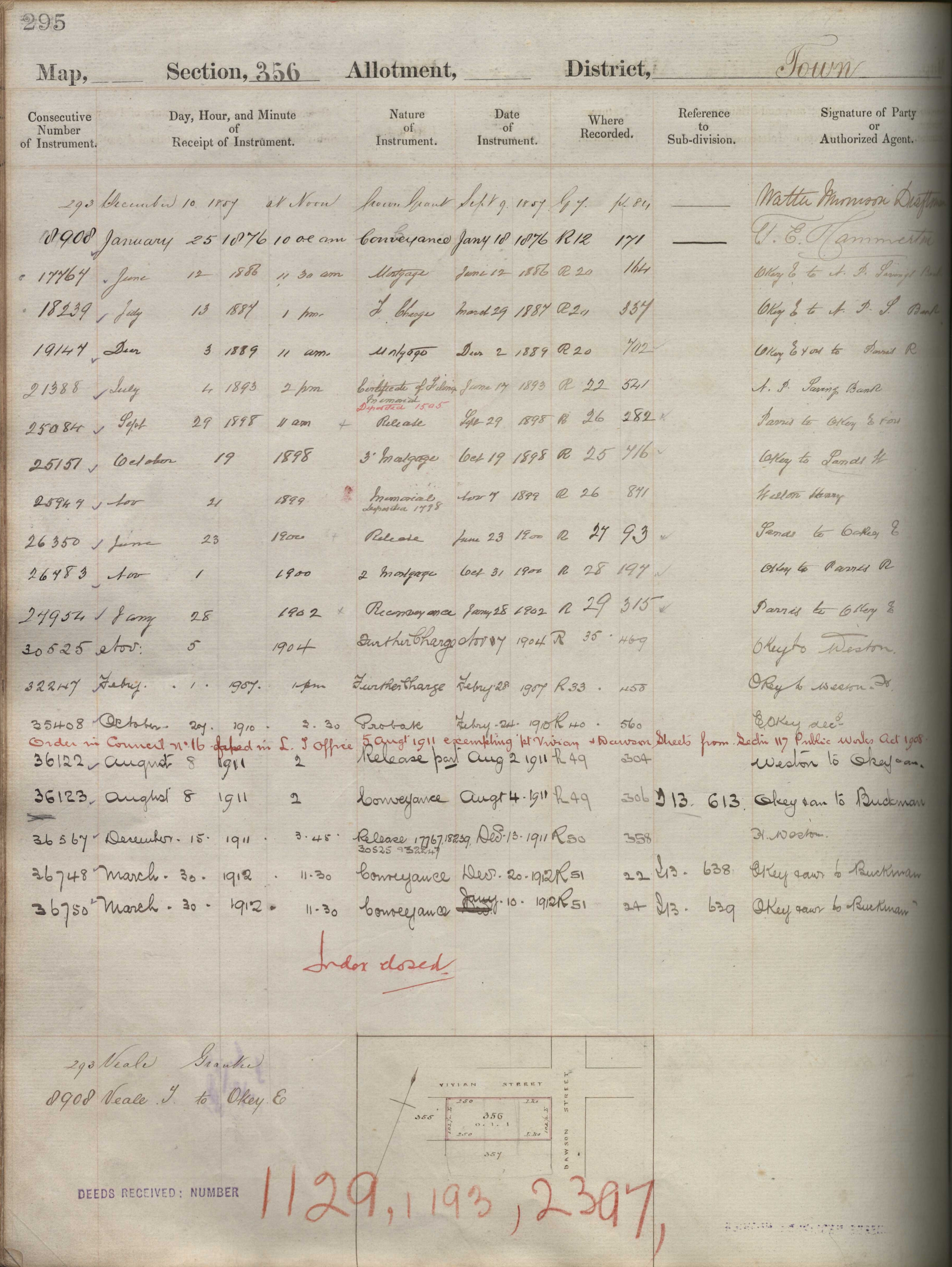Town Section 356, Taranaki Land Deed Index I1 page 295. (Archives New Zealand)