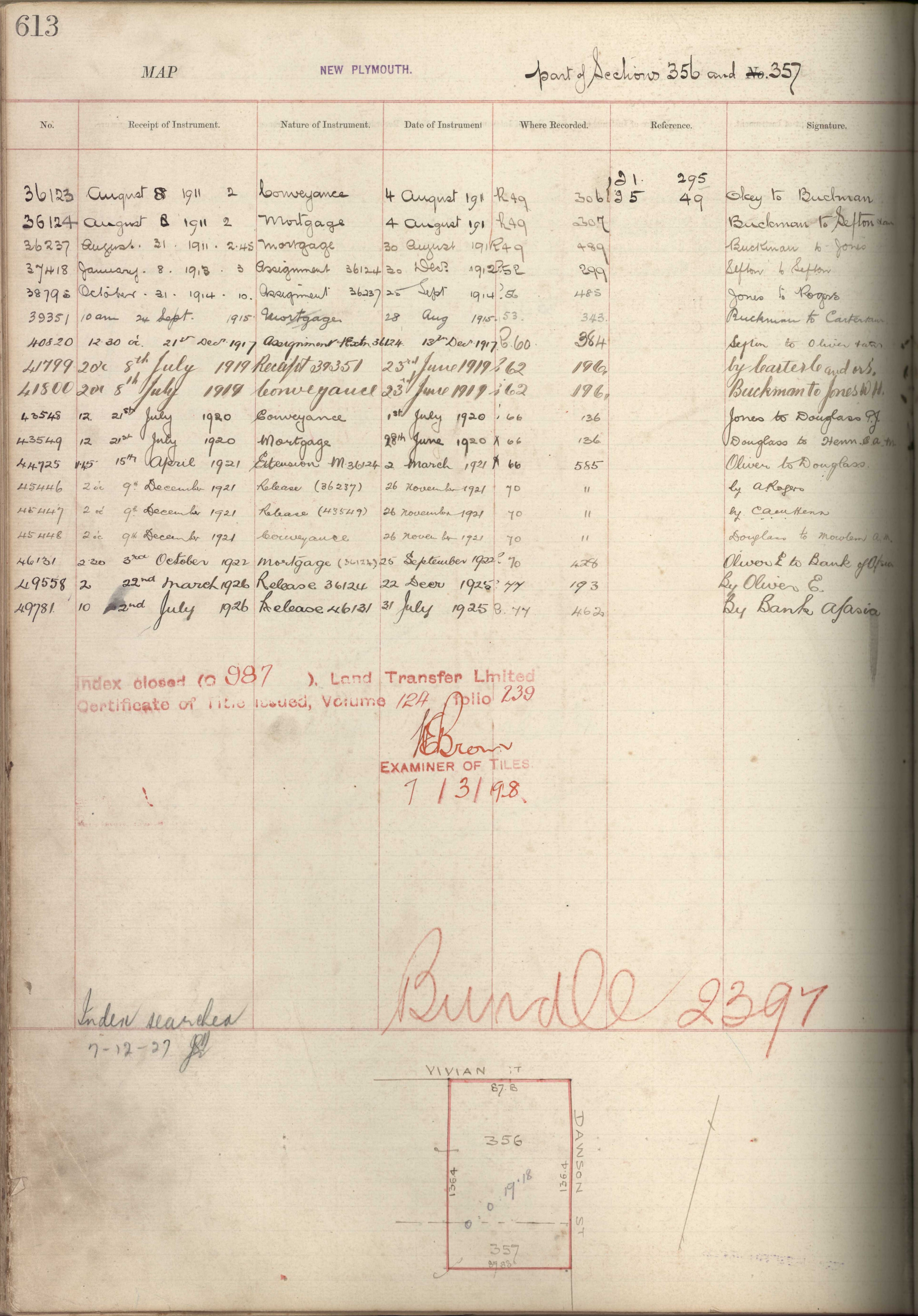 Town Sections 356 and 357, Taranaki Land Deed Index I14 page 613. (Archives New Zealand)