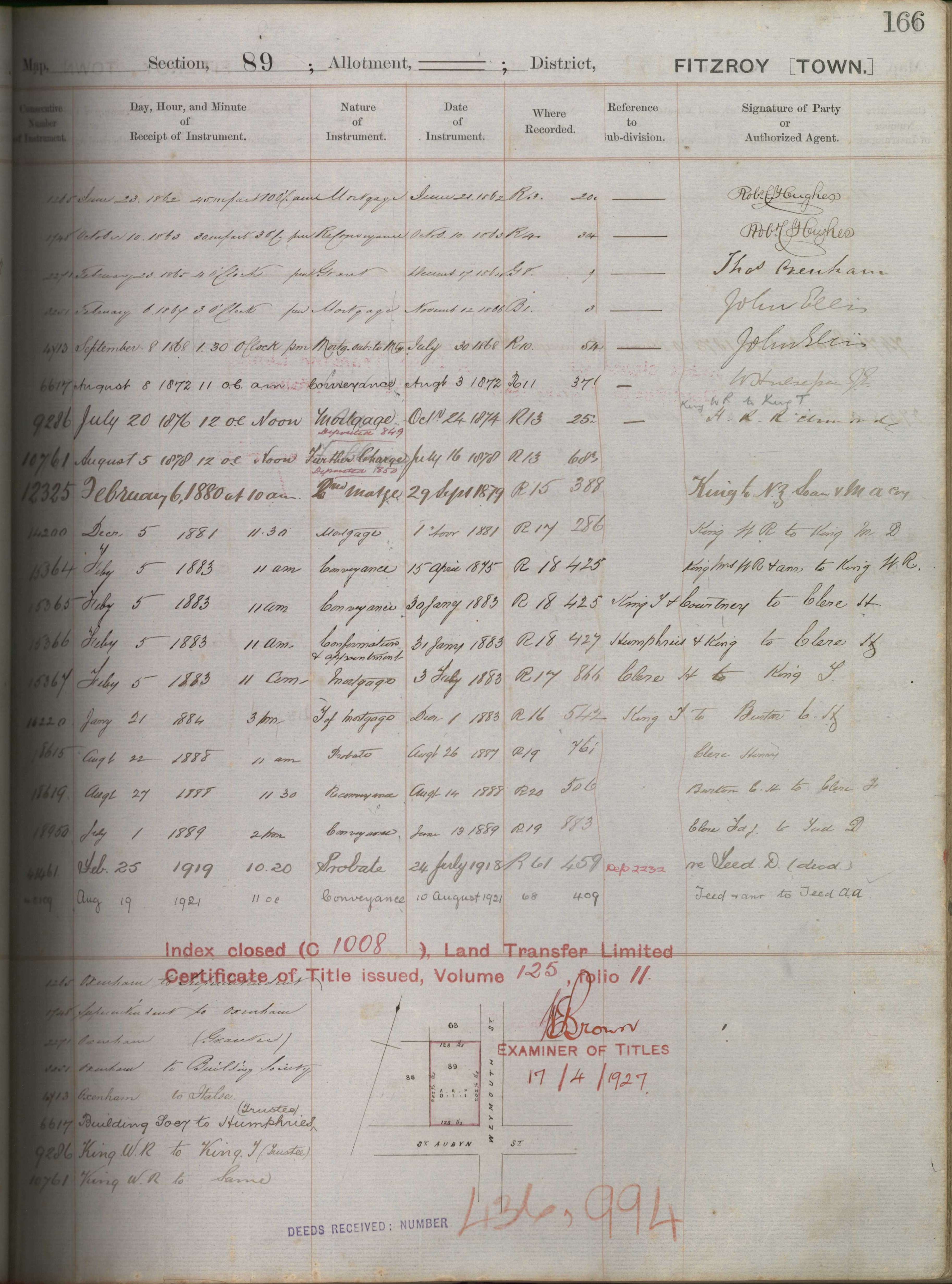 Town Section 89, Taranaki Land Deed Index I3 page 166. (Archives New Zealand)