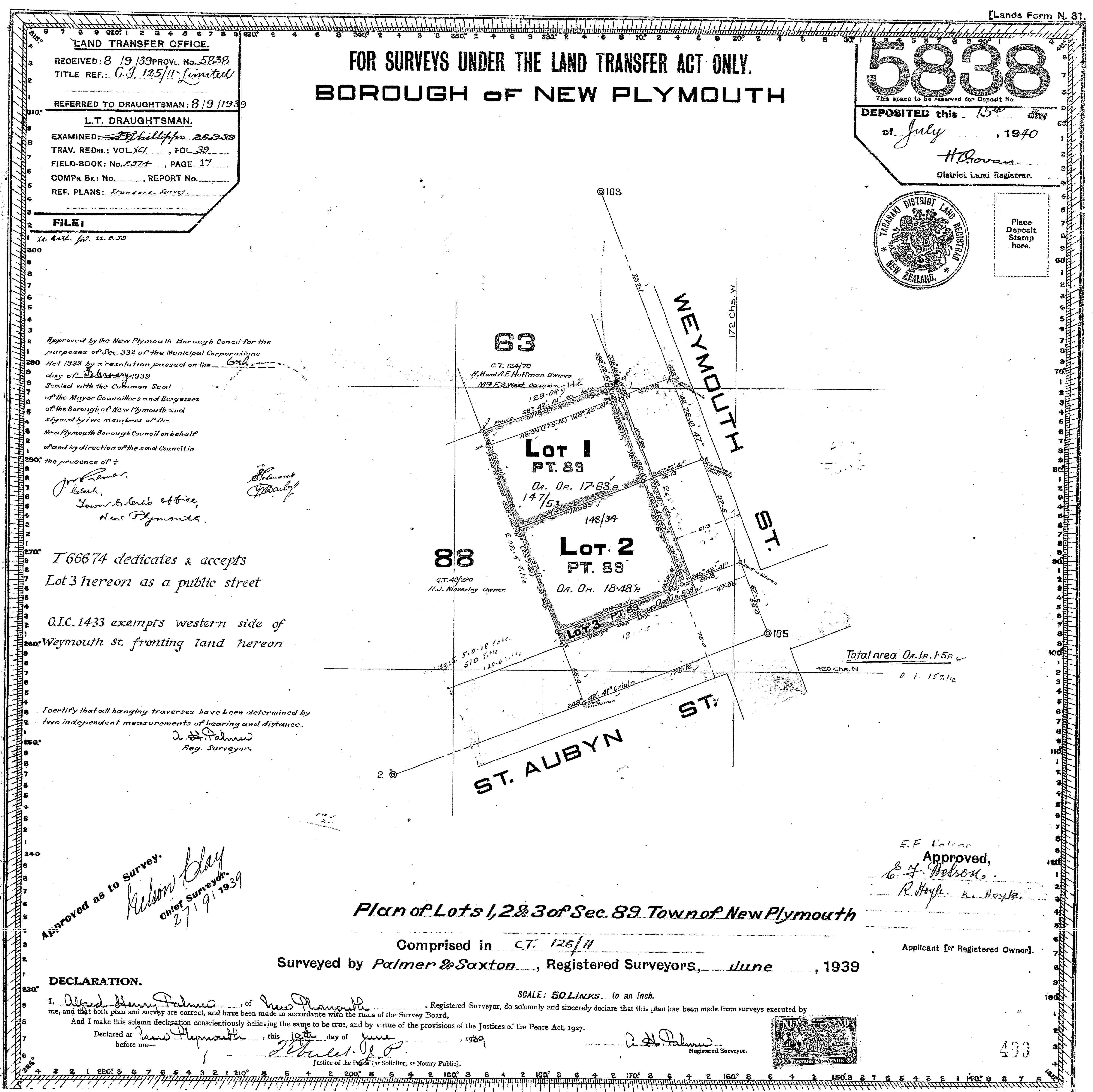 Taranaki (Lot 2) DP5838 Sheet 1 (1939), ICS Pre 300,000 Cadastral Plan Index (Imaged by LINZ)