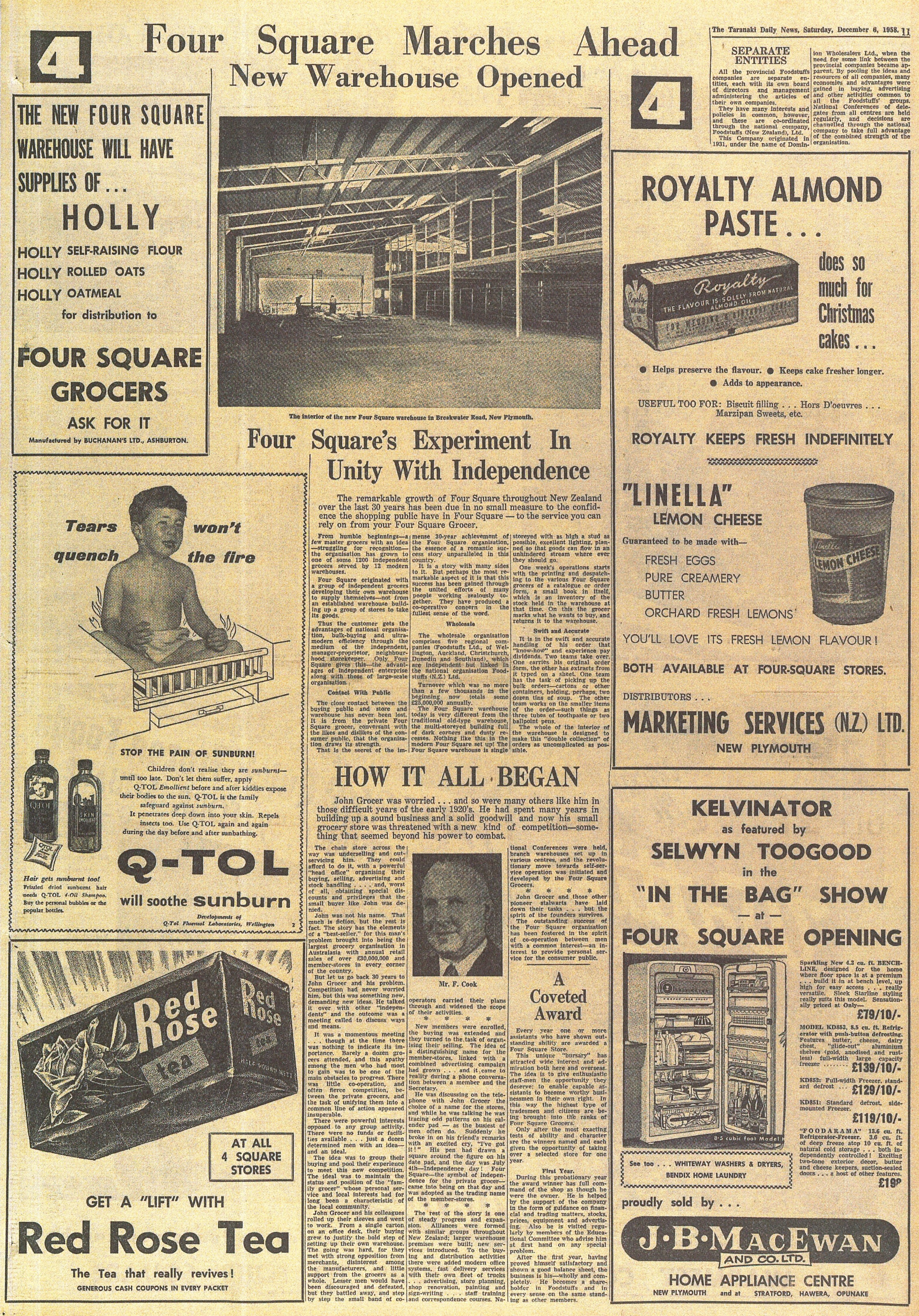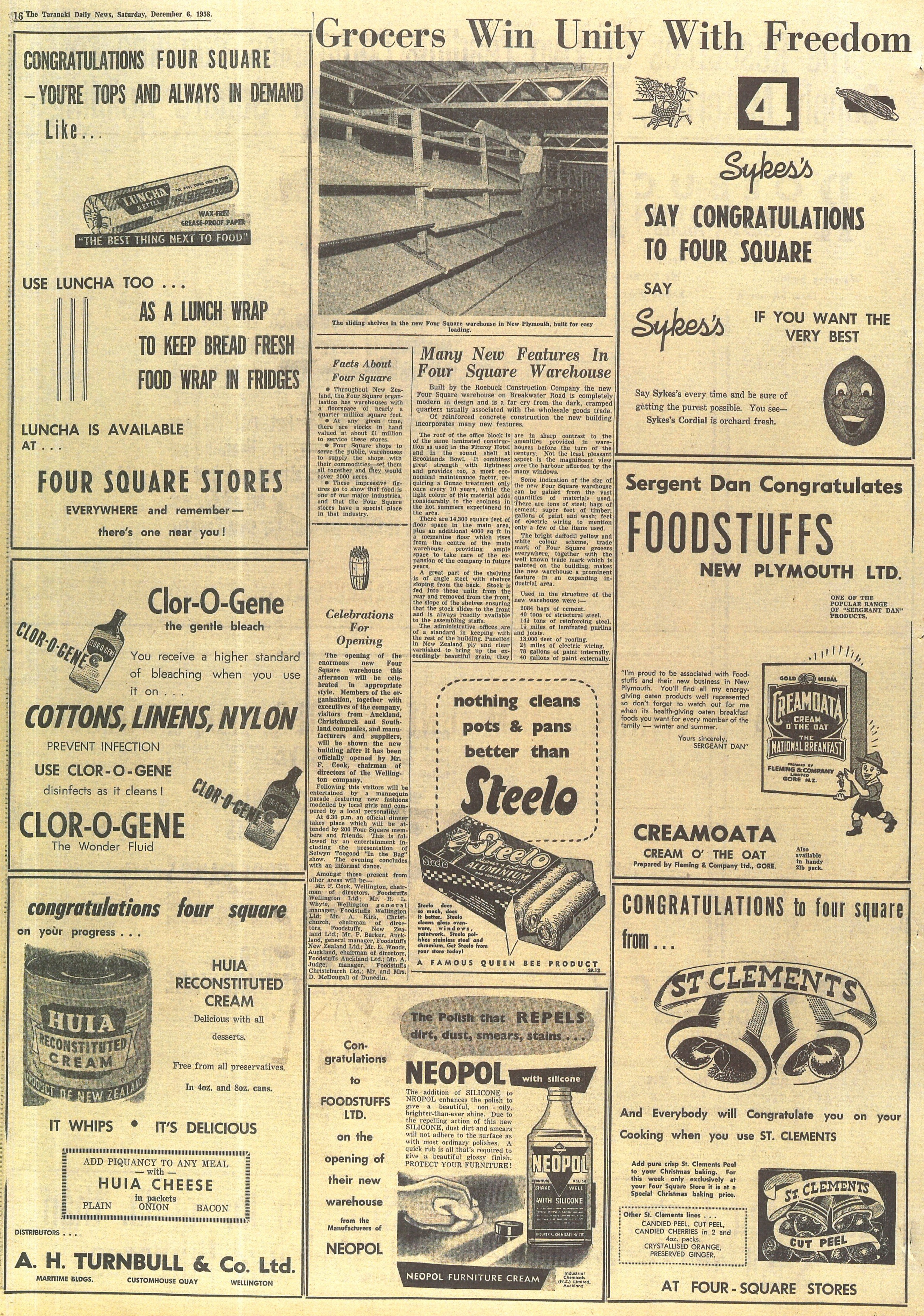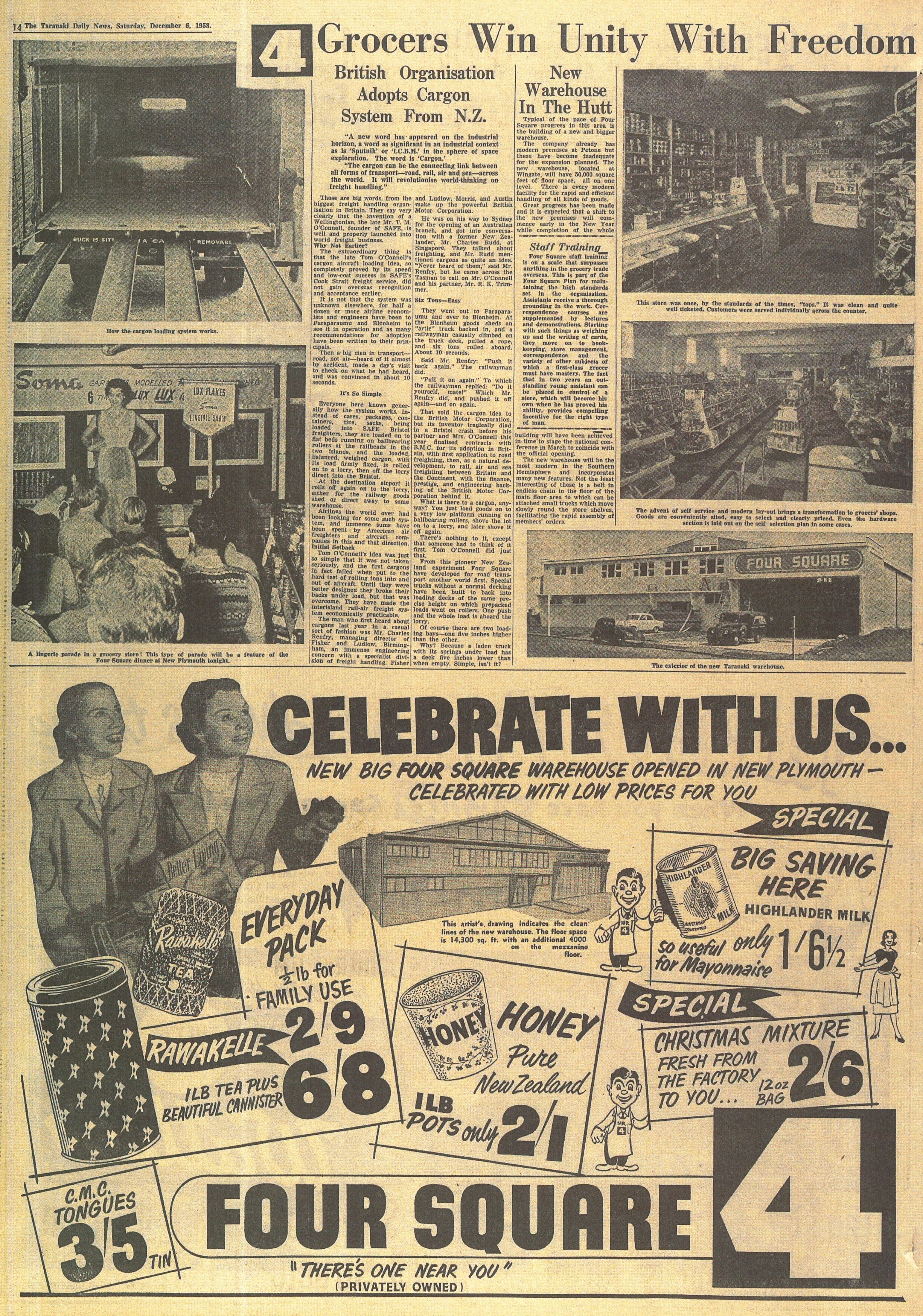Four Square Marches Ahead: New Warehouse Opened (Taranaki Daily News 6 December 1958 pages 11, 14 and 16)