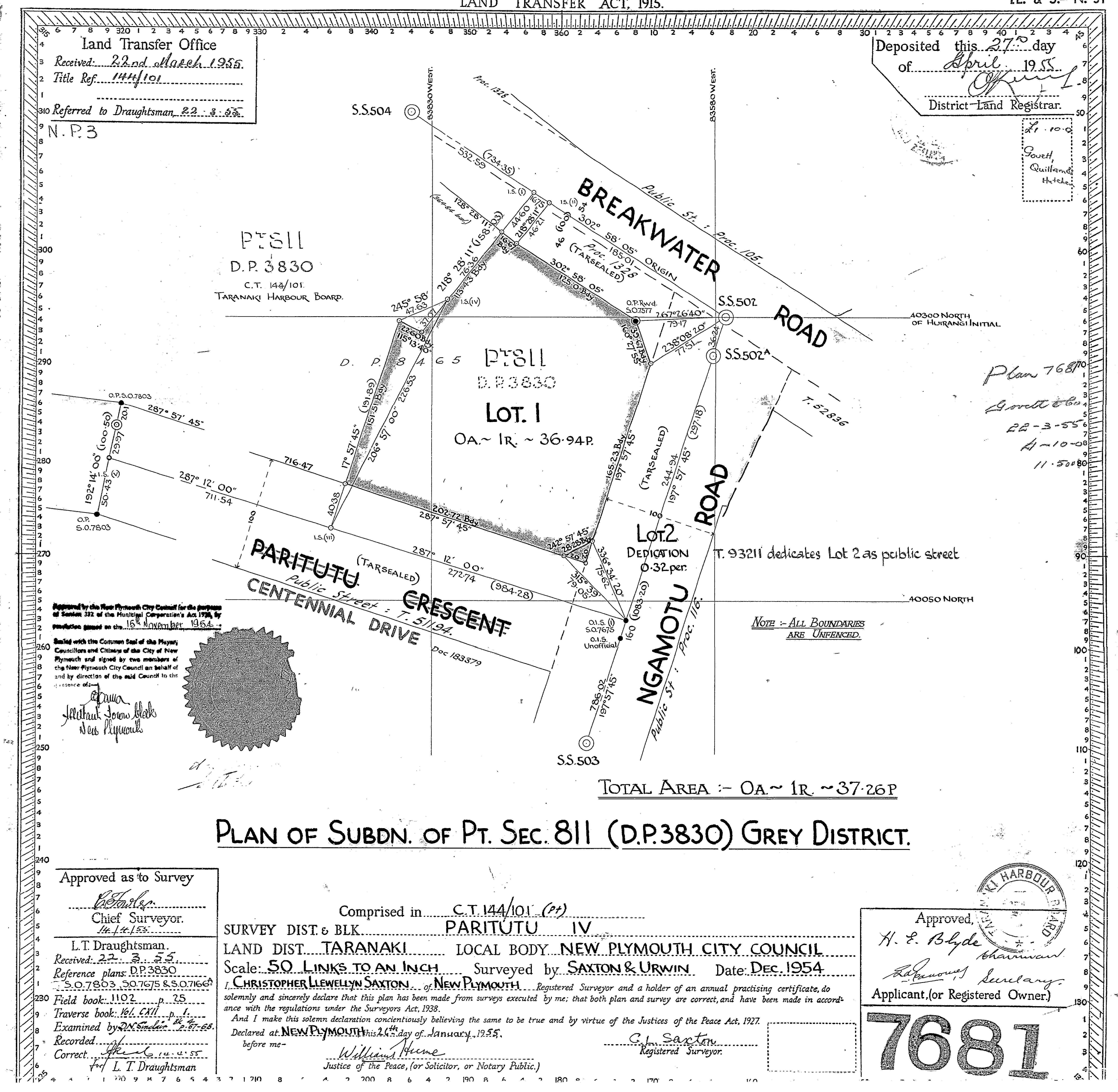 Taranaki DP7681 Sheet 1 (1954), ICS Pre 300,000 Cadastral Plan Index (Imaged by LINZ)