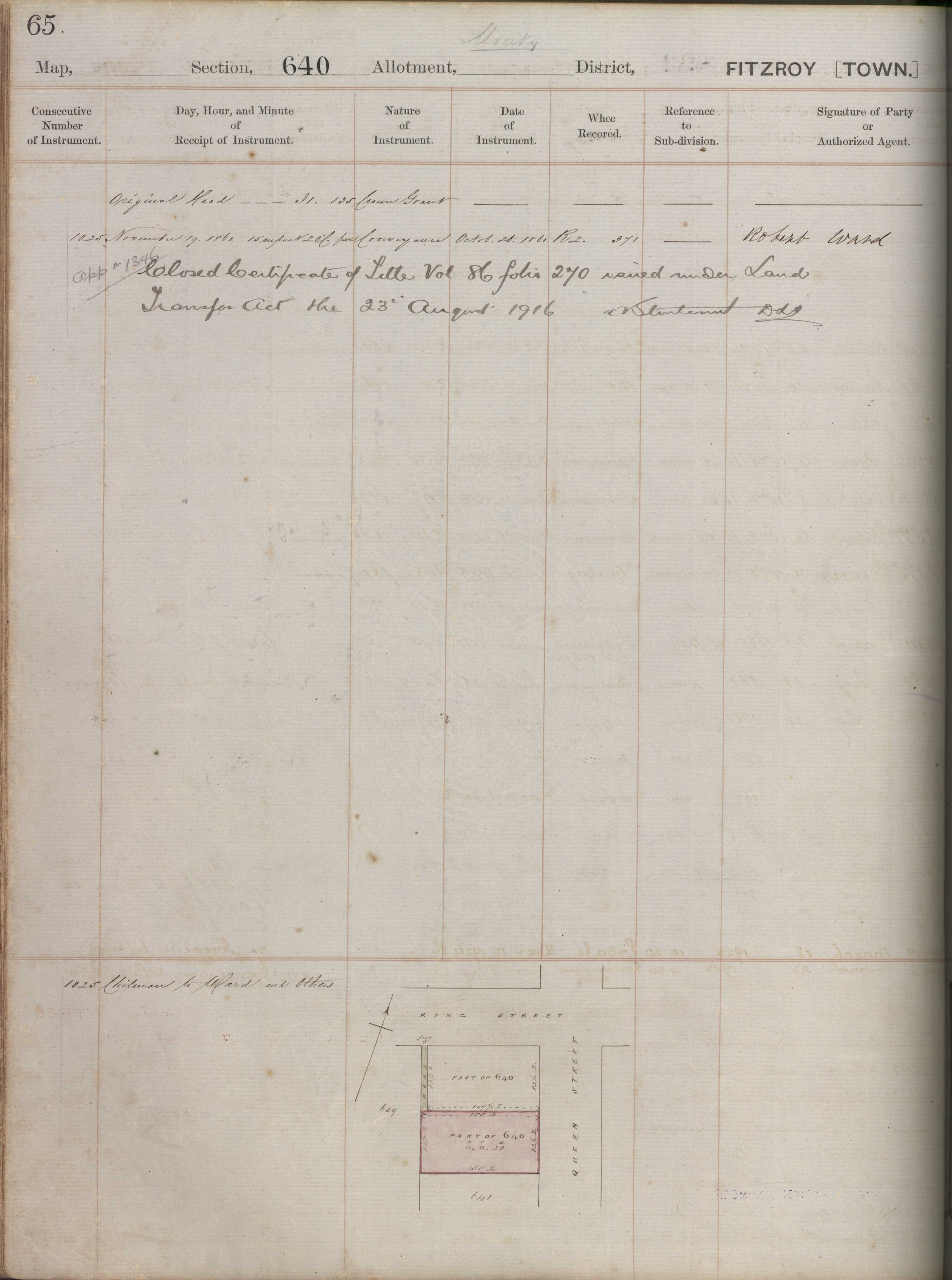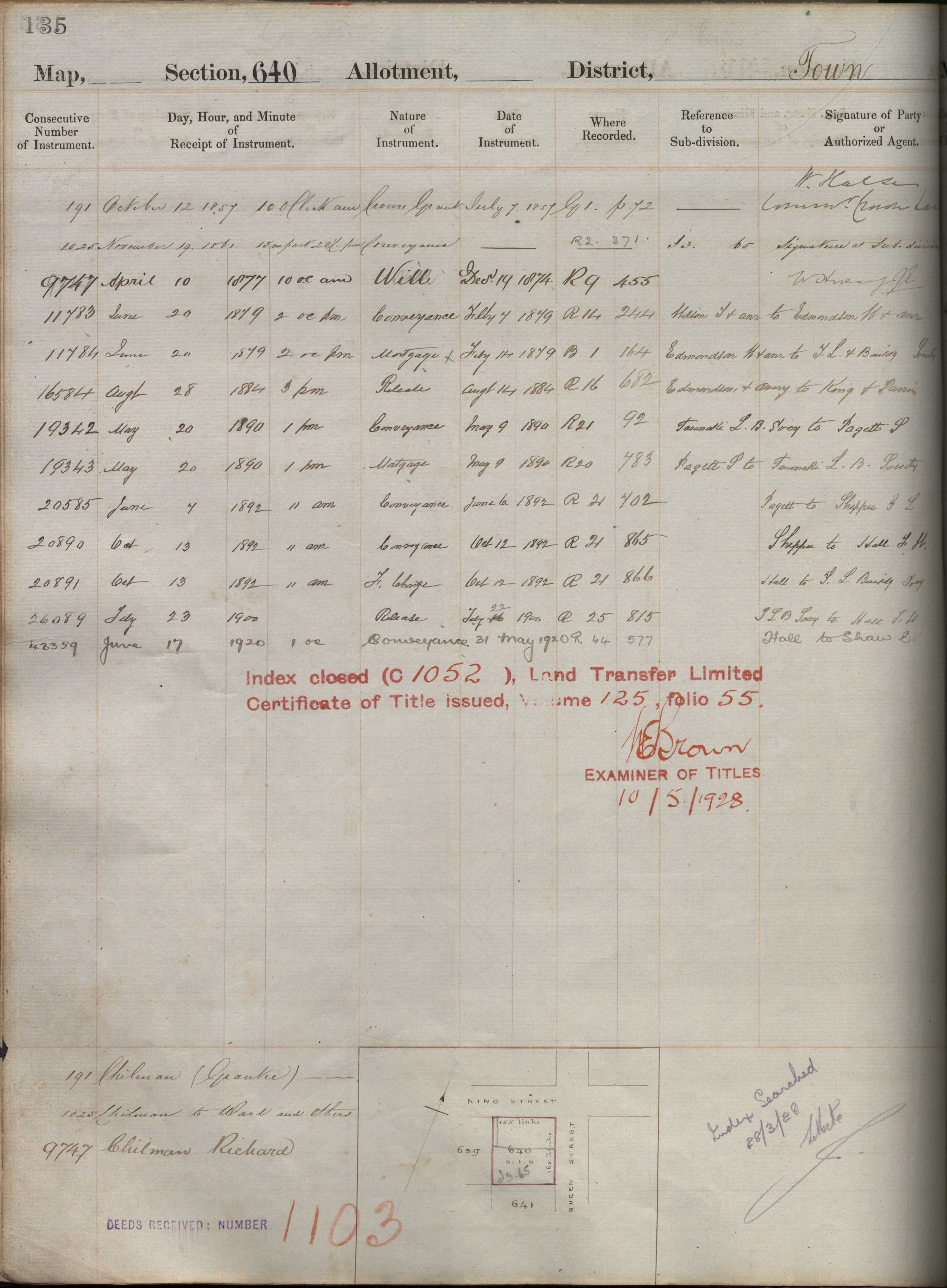 Town Section 640, Taranaki Land Deed Index I1 page 135 and I3 page 65. (Archives New Zealand)